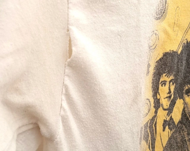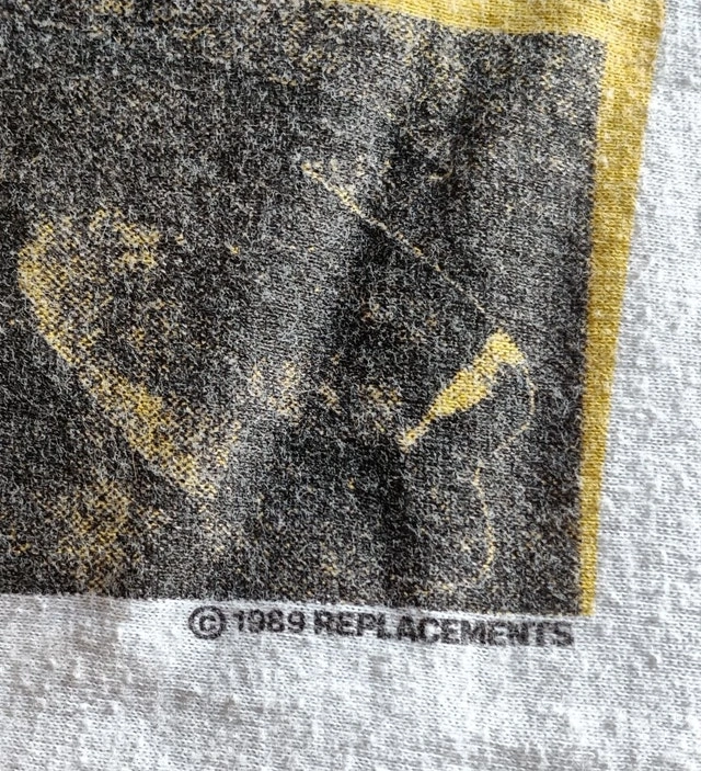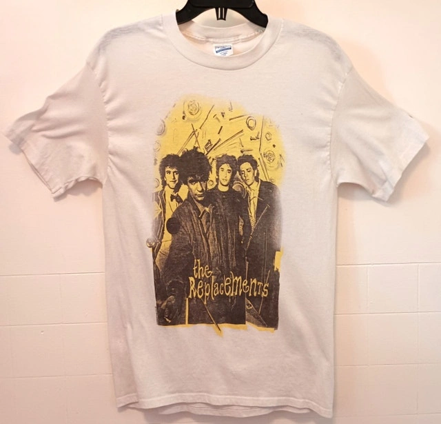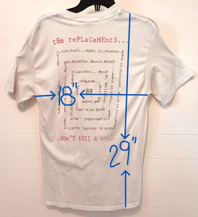 This vintage Replacements "Don't Tell A Soul" tour shirt from 1989 is in good but well-worn condition with some fading on the graphic. Small seam rip on the right sleeve and an almost invisible stain on the back of the left sleeve (see photos for detail). It's a 50% cotton/50% poly blend. The label lists size as XL, but measurements are shown in the photo (it probably fits more like a large). This is not a reproduction/modern re-print. The neck is not stretched out. No shipping. Available for a safe, public meet-up in downtown Kitchener.
