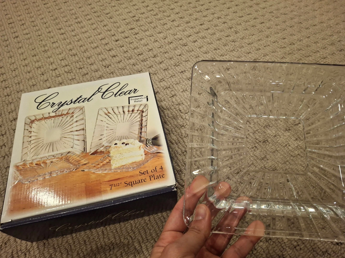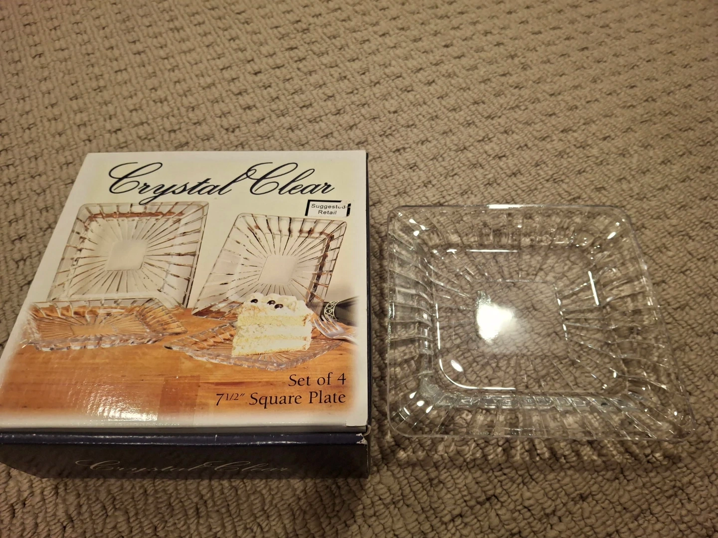 Set of 4 Crystal Clear 7 1/2 inch square plates. Made of glass. Perfect for serving appetizers or desserts.- 20 cad