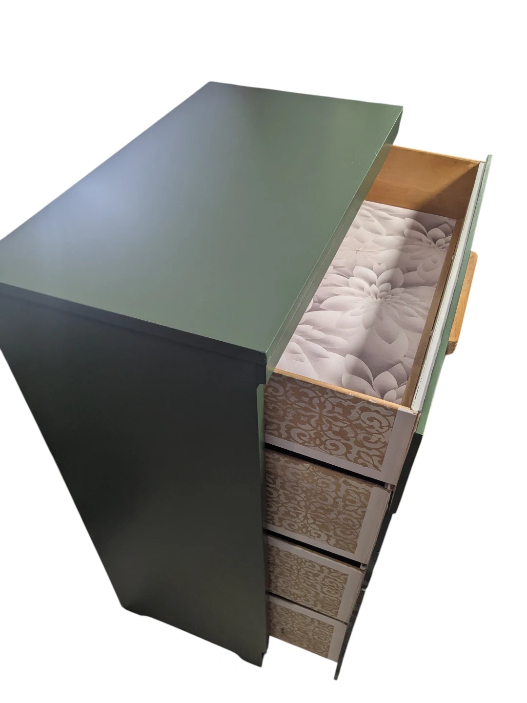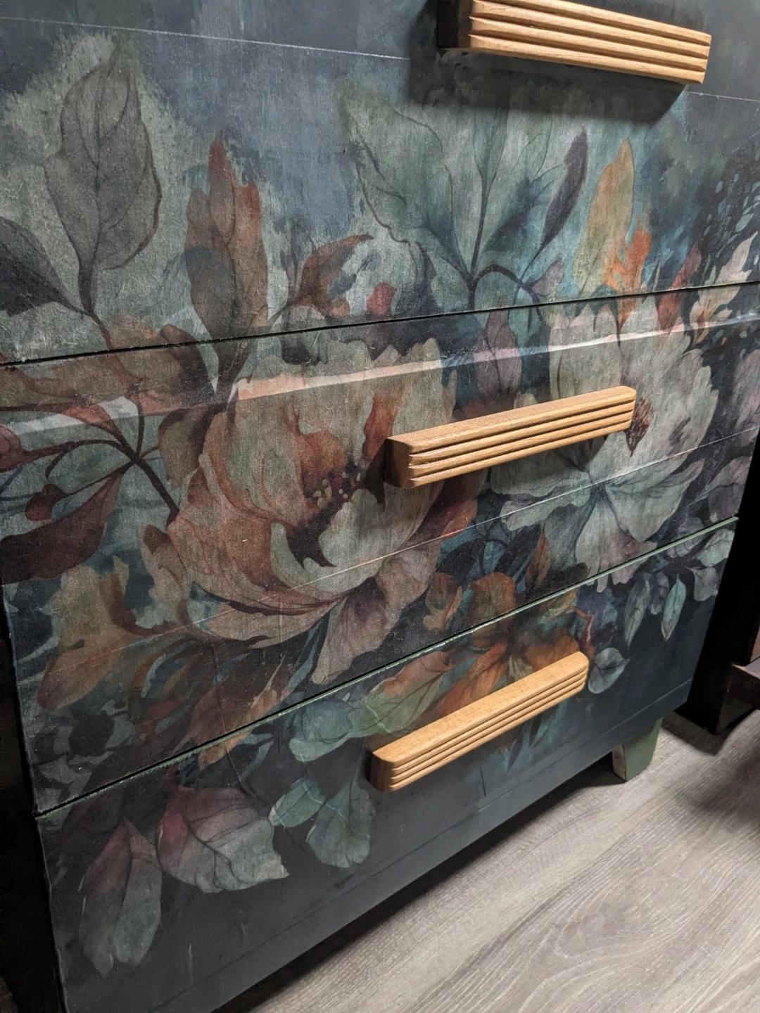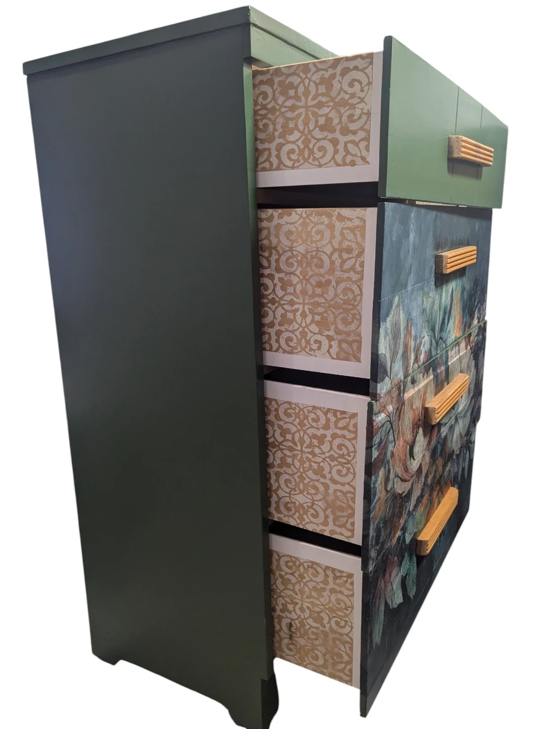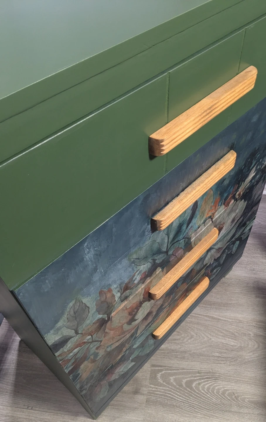 Stylish upcycled dresser finished in a soft green with a floral decoupage image on the drawer fronts. Sealed for protection and paired with natural wood handles for a clean, modern look. Works great as a small dresser, or accent storage.