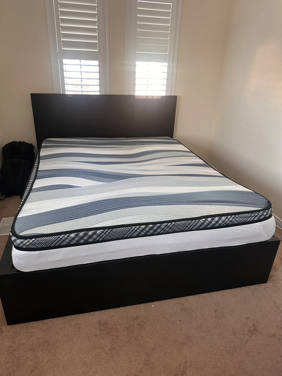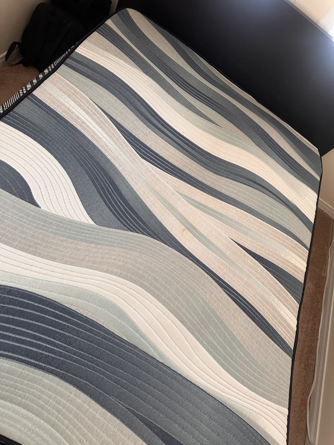 Selling a queen size mattress. It features a wavy pattern in shades of grey and white. It's in good condition and ready for a new home!