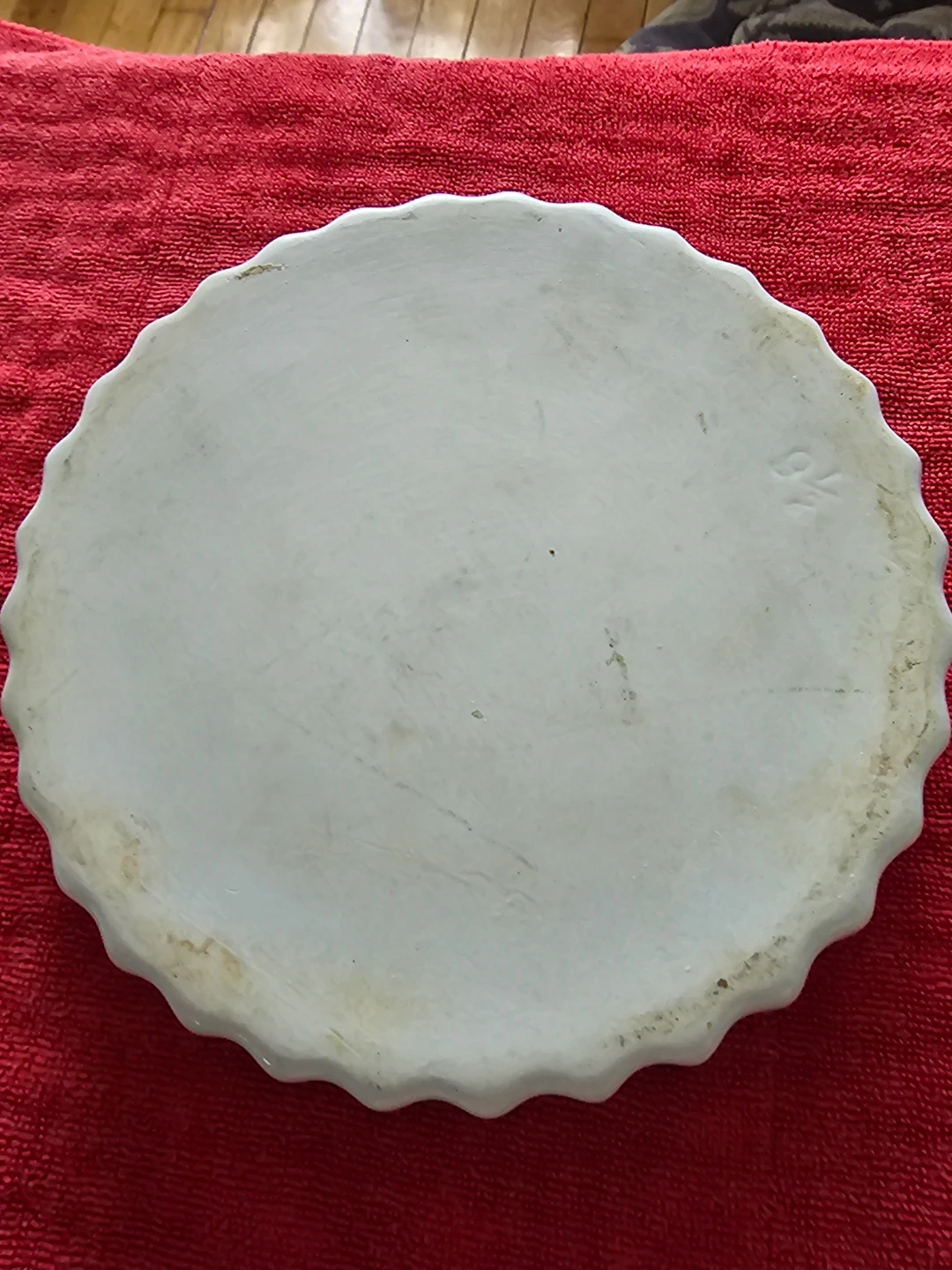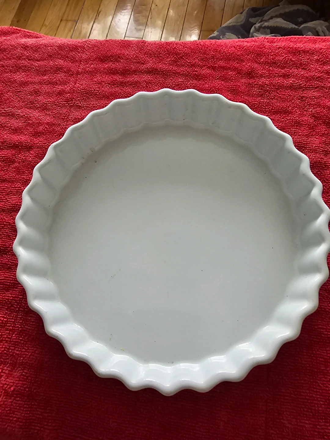 A round ceramic pie plate with a fluted edge. It's perfect for baking pies and tarts. The ceramic material ensures even heating for delicious results!