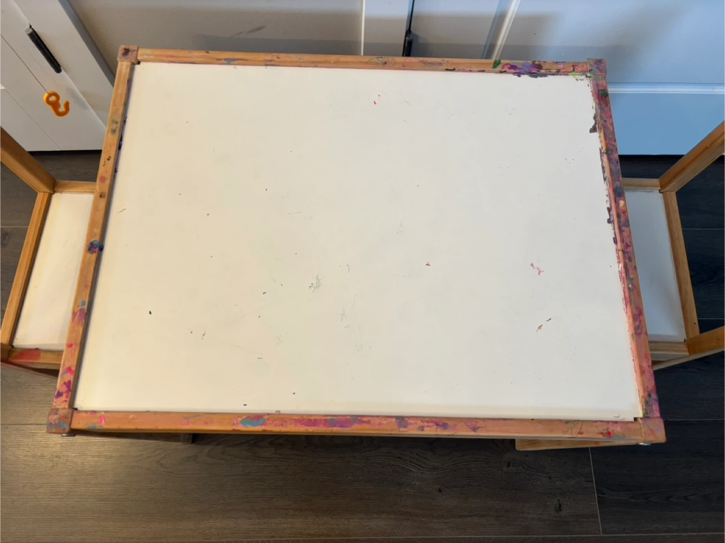 A cute little table and chairs set for kids! Perfect for arts and crafts, snack time, or just a fun place to hang out. It's in good condition and ready for a new home where it can inspire creativity and play. There are some paint stains but it’s fine otherwise.