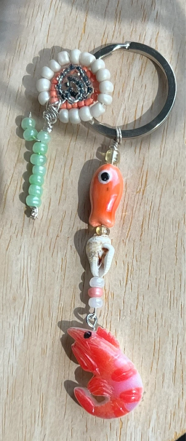 This unique keychain features a collection of colourful beads, a decorative flower charm, and a cute shrimp charm. It also includes small shell accents. It's a fun accessory for your keys or bag!