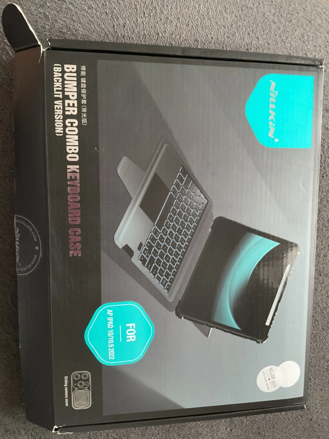 This Nillkin Bumper Combo Keyboard Case is designed for the iPad 10th Gen (2022). It features a backlit keyboard and a protective bumper design. It also includes a USB-C cable for charging.