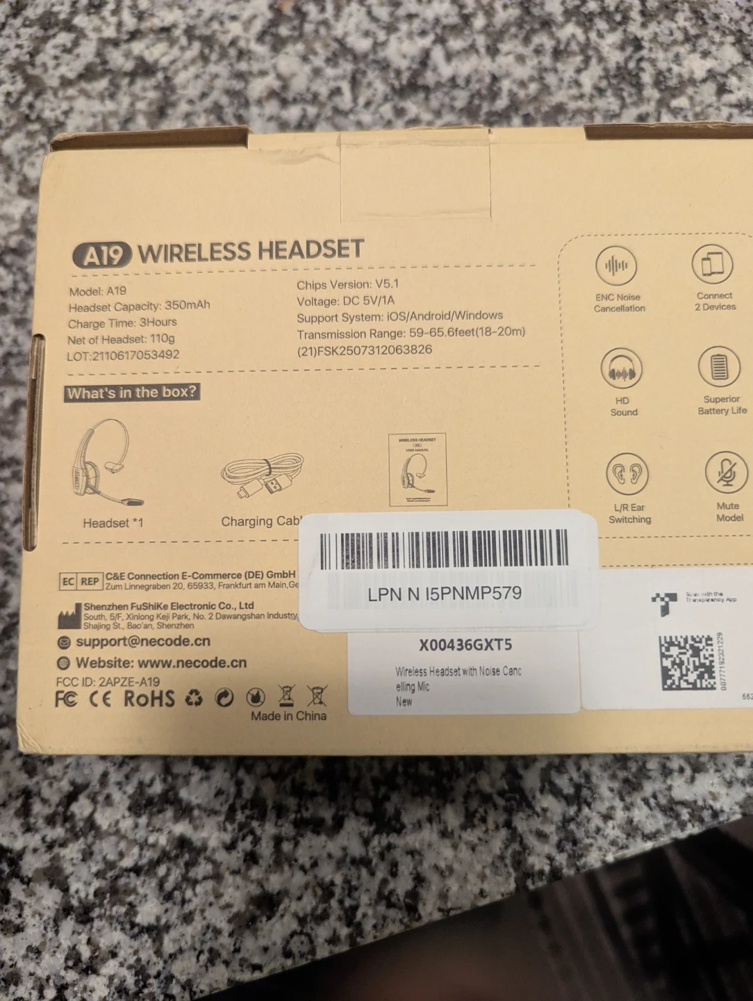 This A19 wireless headset has a 350mAh battery capacity and charges in 3 hours. It supports iOS, Android, and Windows, with a transmission range of 59-65.6 feet. It's designed with ENC noise cancellation and HD sound.