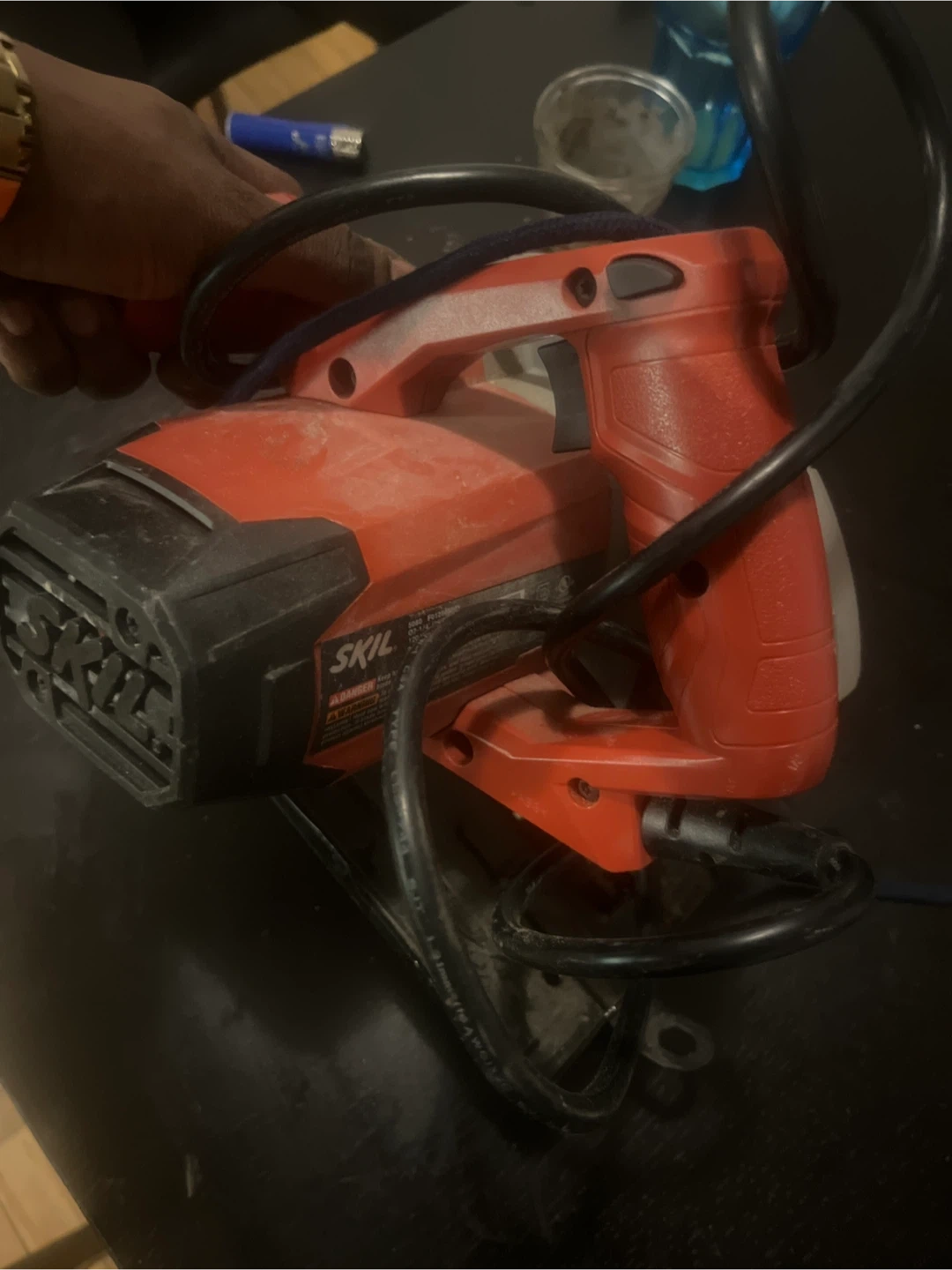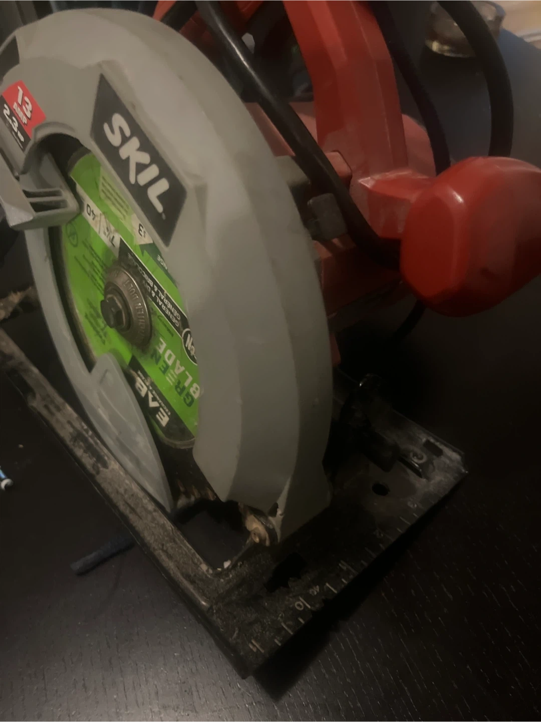SKIL 7-1/4 inch circular saw with a 13 amp motor. This power saw is red and grey. It includes a green SKIL "Green Blade" 40-tooth blade. This saw is ready for your next woodworking project! Like new