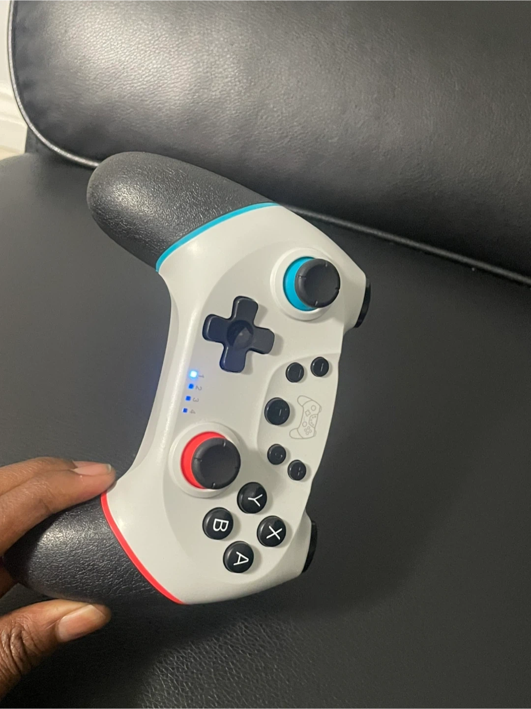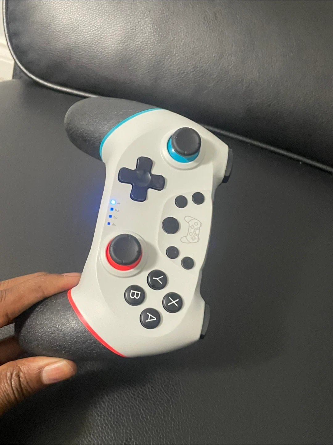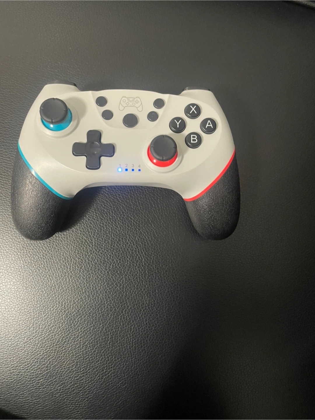 This is a wireless controller for Nintendo Switch. It's white with red and blue accents on the grips. It charges via USB-C and features a classic button layout. You can also use it for your phone or tablet or laptop and tv