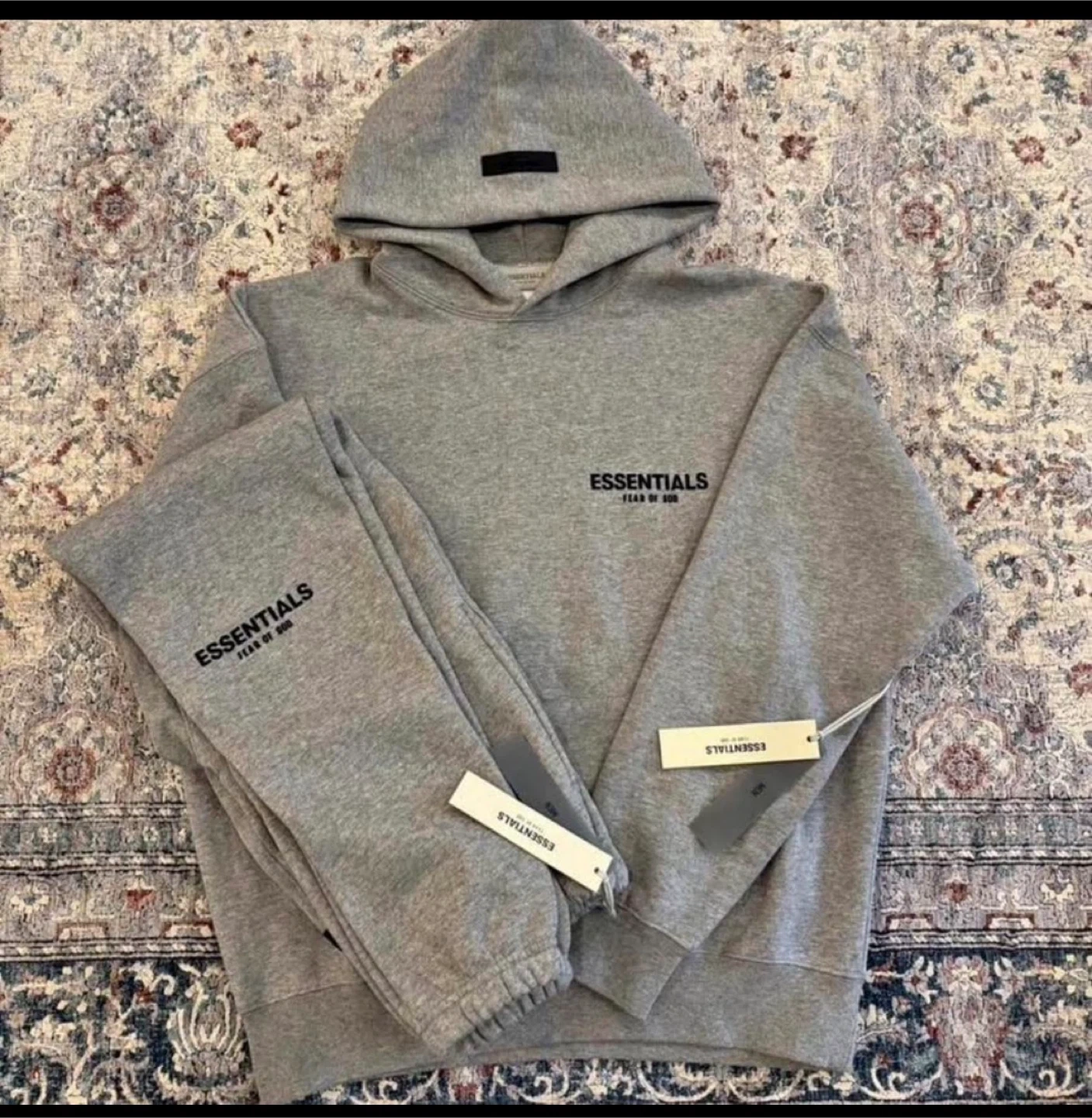 This is a grey ESSENTIALS Fear of God hoodie and sweatpants set. The set includes a hooded sweatshirt with a front pocket and drawstring sweatpants. It's made of a soft cotton blend.