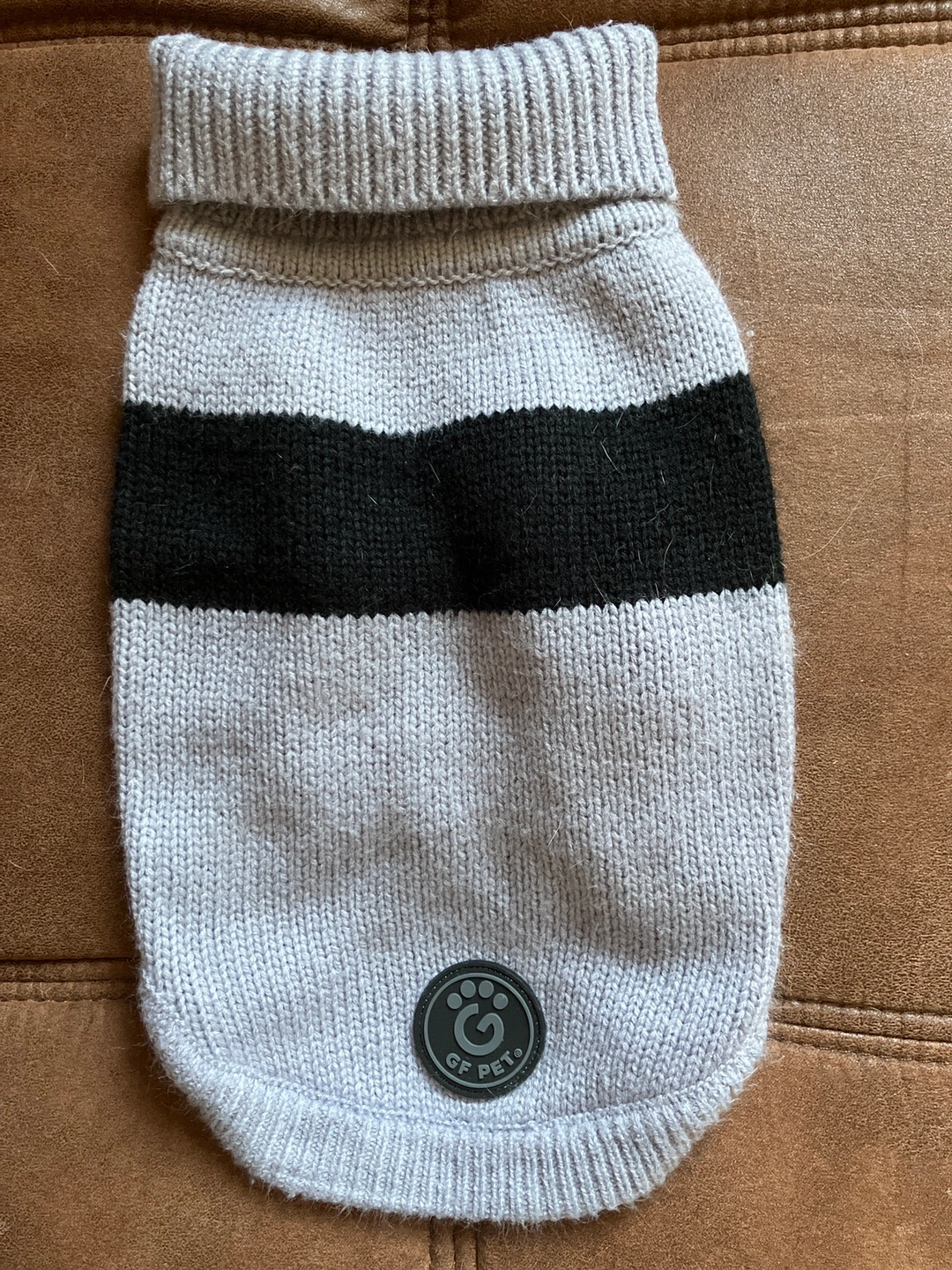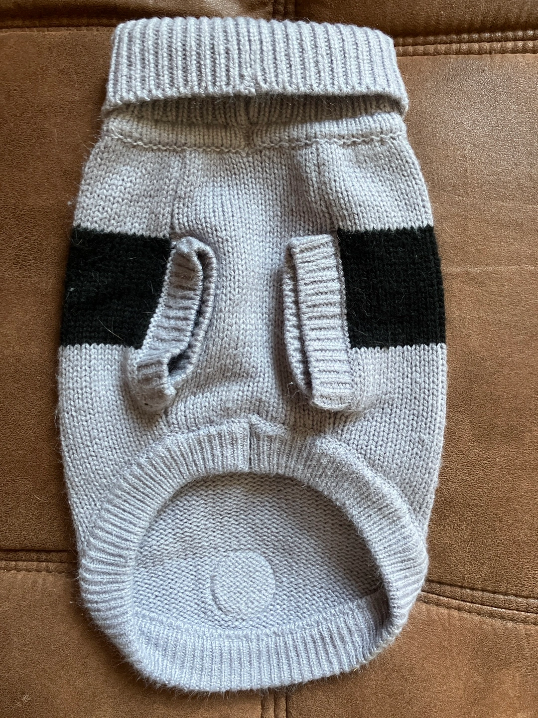 Grey knitted dog sweater with black stripe detail. It features a ribbed turtleneck and leg openings for comfort. Made from soft, warm material. Great condition, but my dog grew out of it too quickly. Only worn a handful of times.