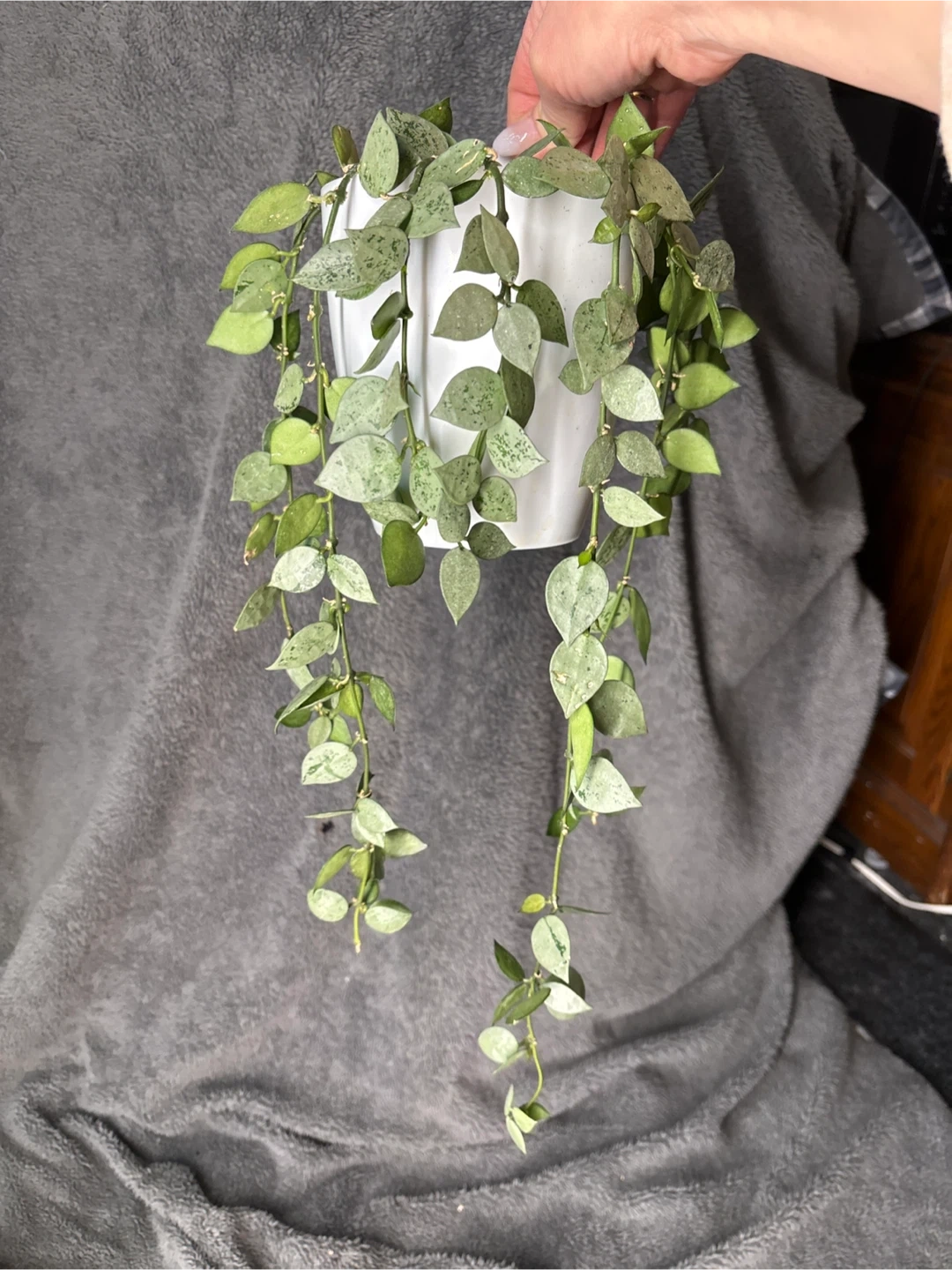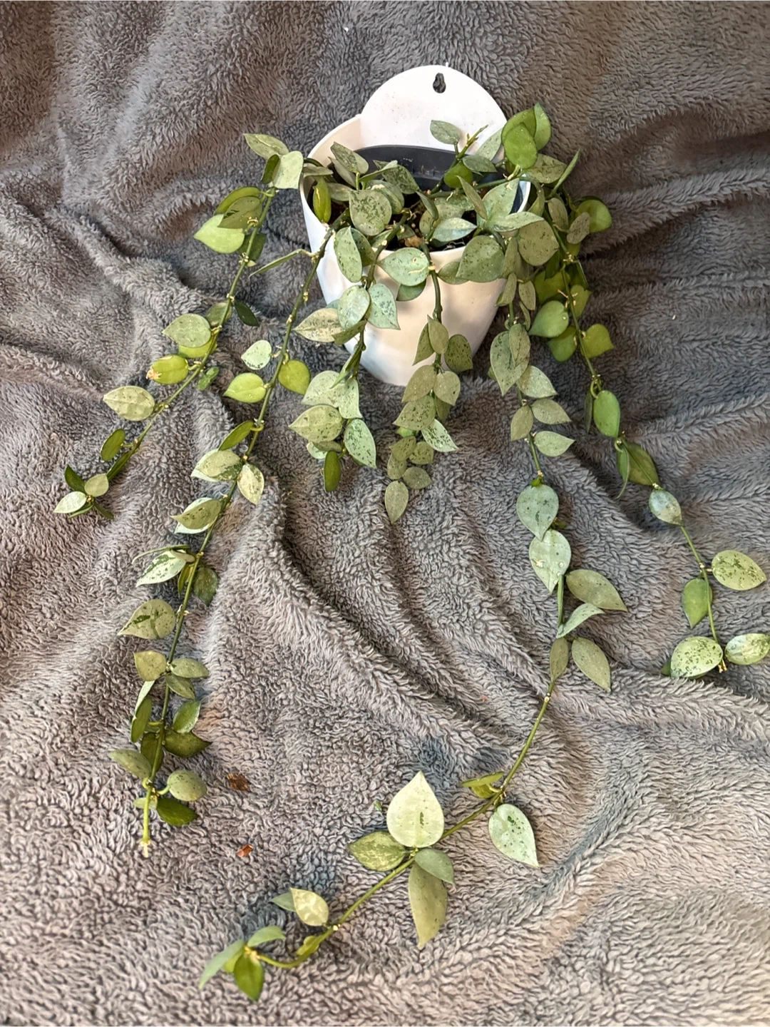 This Hoya Carnosa Compacta features beautiful variegated leaves. It comes in a simple white pot that can be easily hung on any wall or hook . The plant is trailing and would add a unique touch to any space. Hoya “Eskimo or Inuit”.