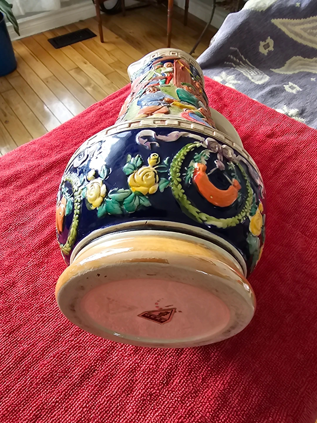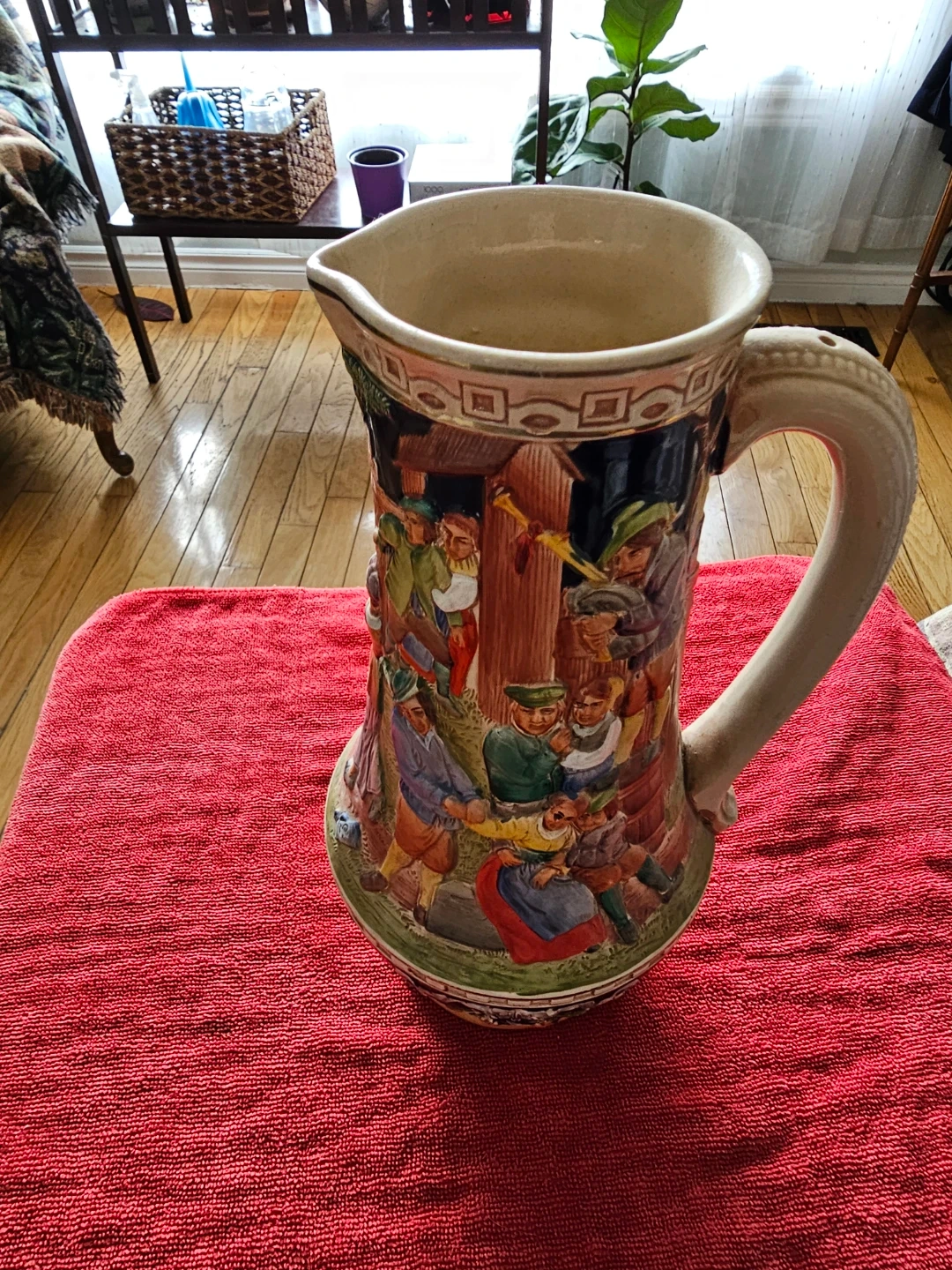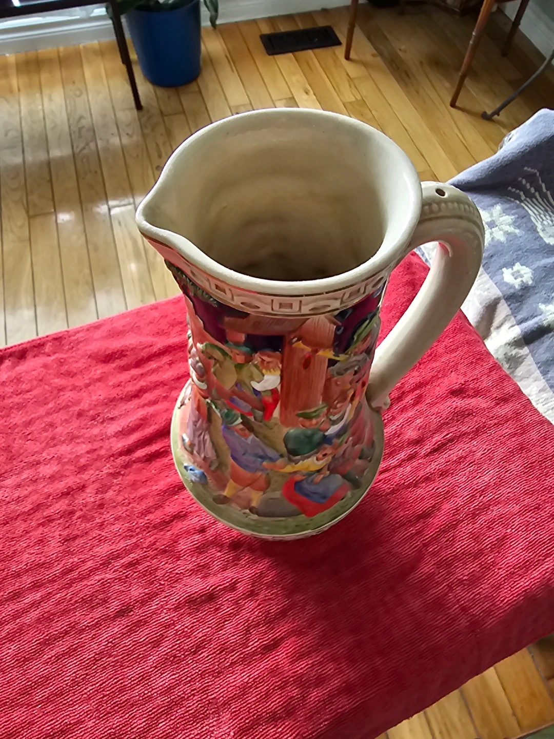 This is a ceramic pitcher featuring a detailed village scene in relief. It has a large handle and a spout for pouring. The design includes various figures and floral elements, with a dark blue background on the upper portion. The base is a light tan colour. It's a decorative piece that would stand out on display.