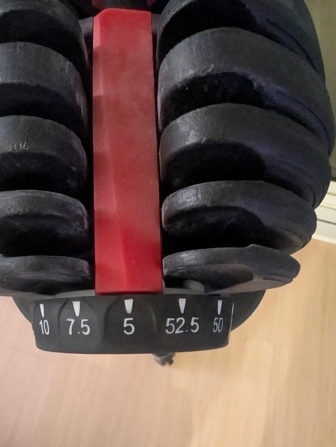 A pair of adjustable dumbbells with weights ranging from 5 to 52.5 lbs each. Dumbbell wrack is included, it's got wheels for easy moving. Worked great as a home alternative until we ended up moving into a building with its own gym :)