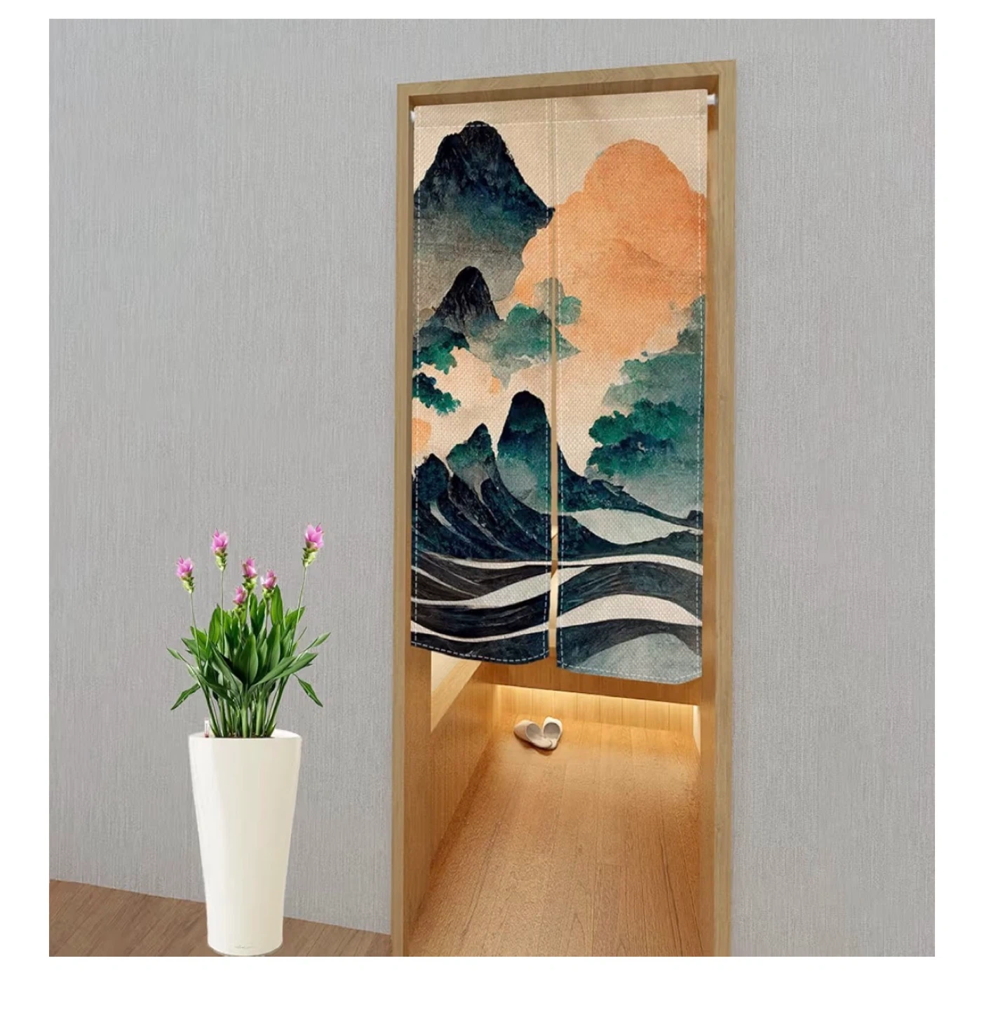 NEW, in package, never used. Japanese style door curtain featuring a mountain and cloud landscape design. Fabric is approximately 33.5” wide x 47.2” long. Perfect for adding a touch of artistic flair to doorways or room dividers. New, never used.