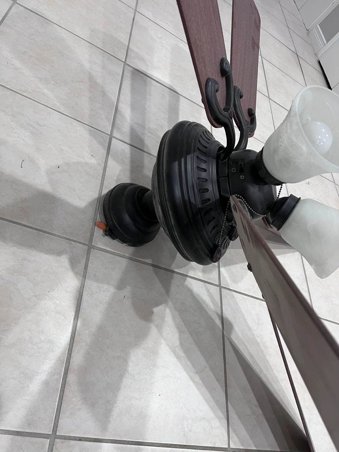The blades are a dark wood colour, and the base is black. It's in good condition and ready to be installed!