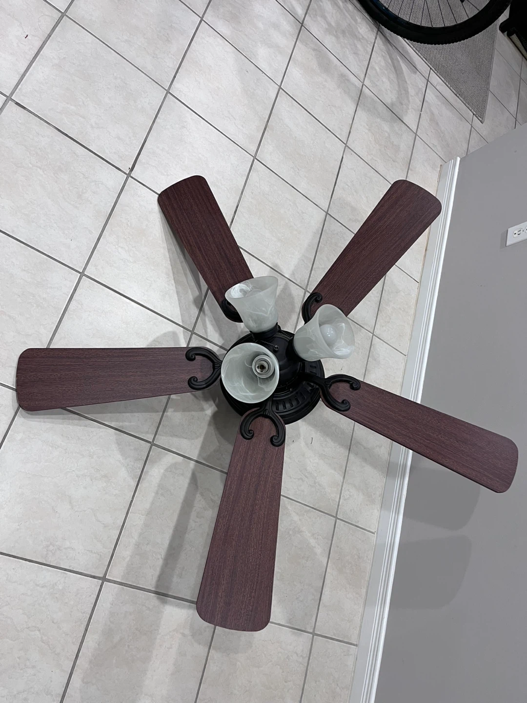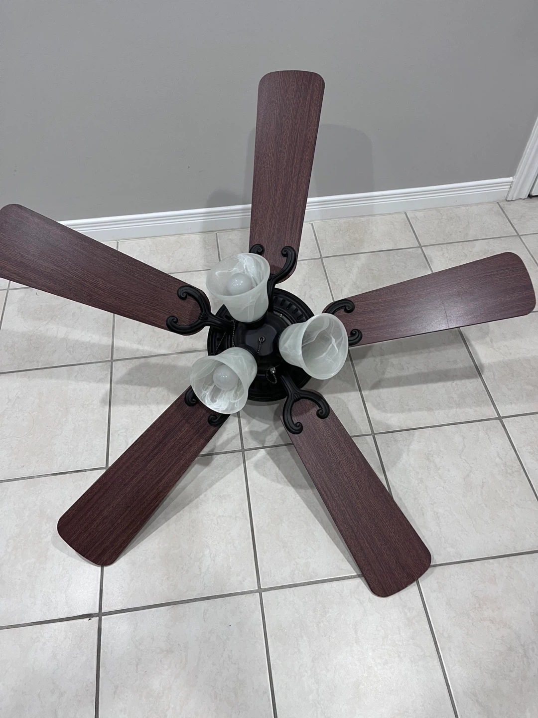 Selling a used ceiling fan with lights. It features five blades and three light fixtures (one light/bulb missing, buyer will need to purchase it).