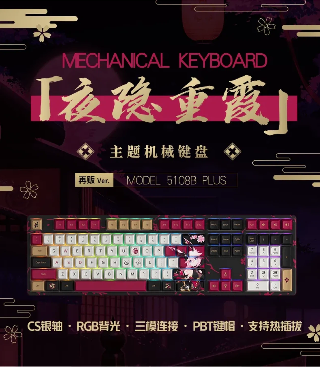 This is a mechanical keyboard with a themed design. It features RGB backlighting and PBT keycaps. The keyboard supports three-mode connection and hot-swappable switches.