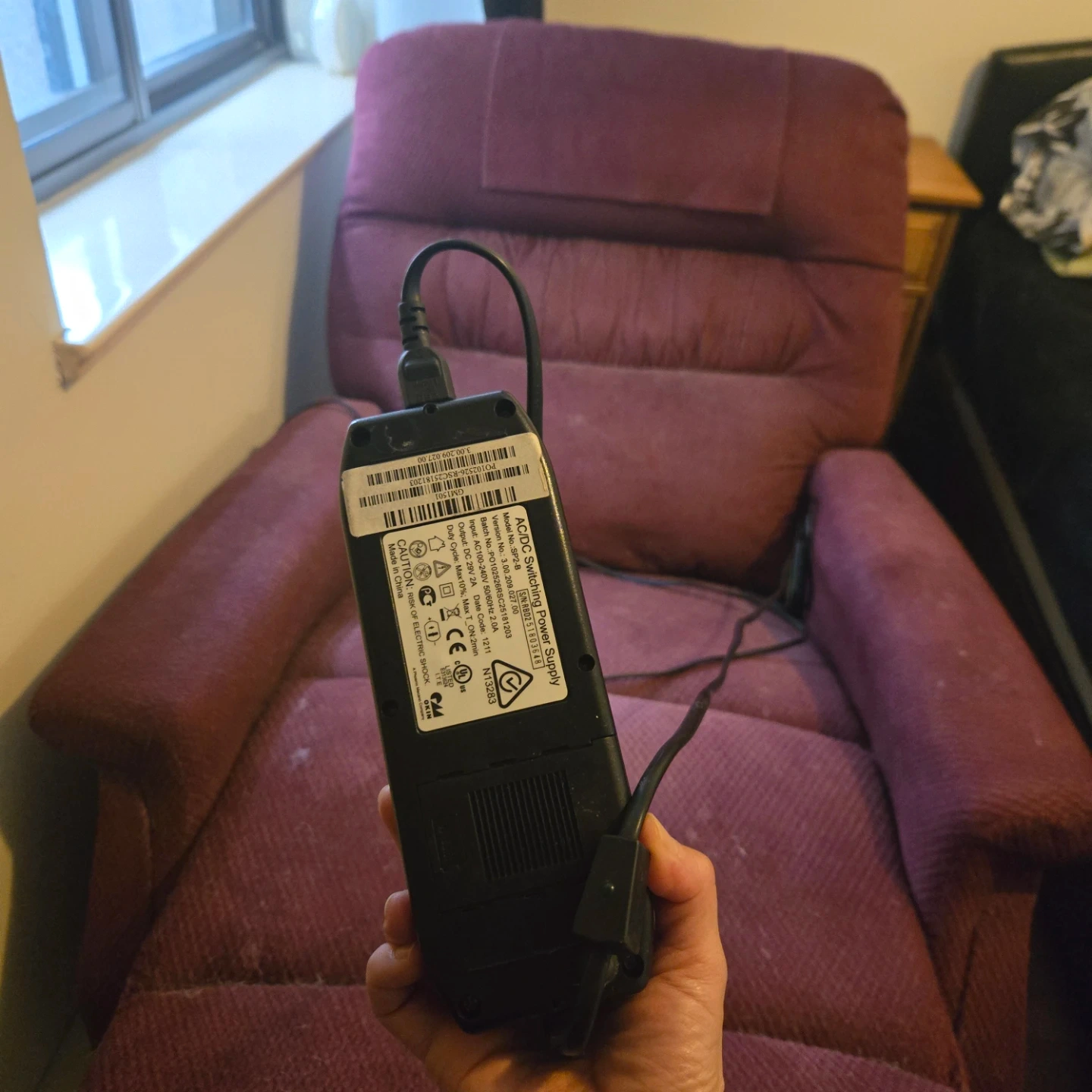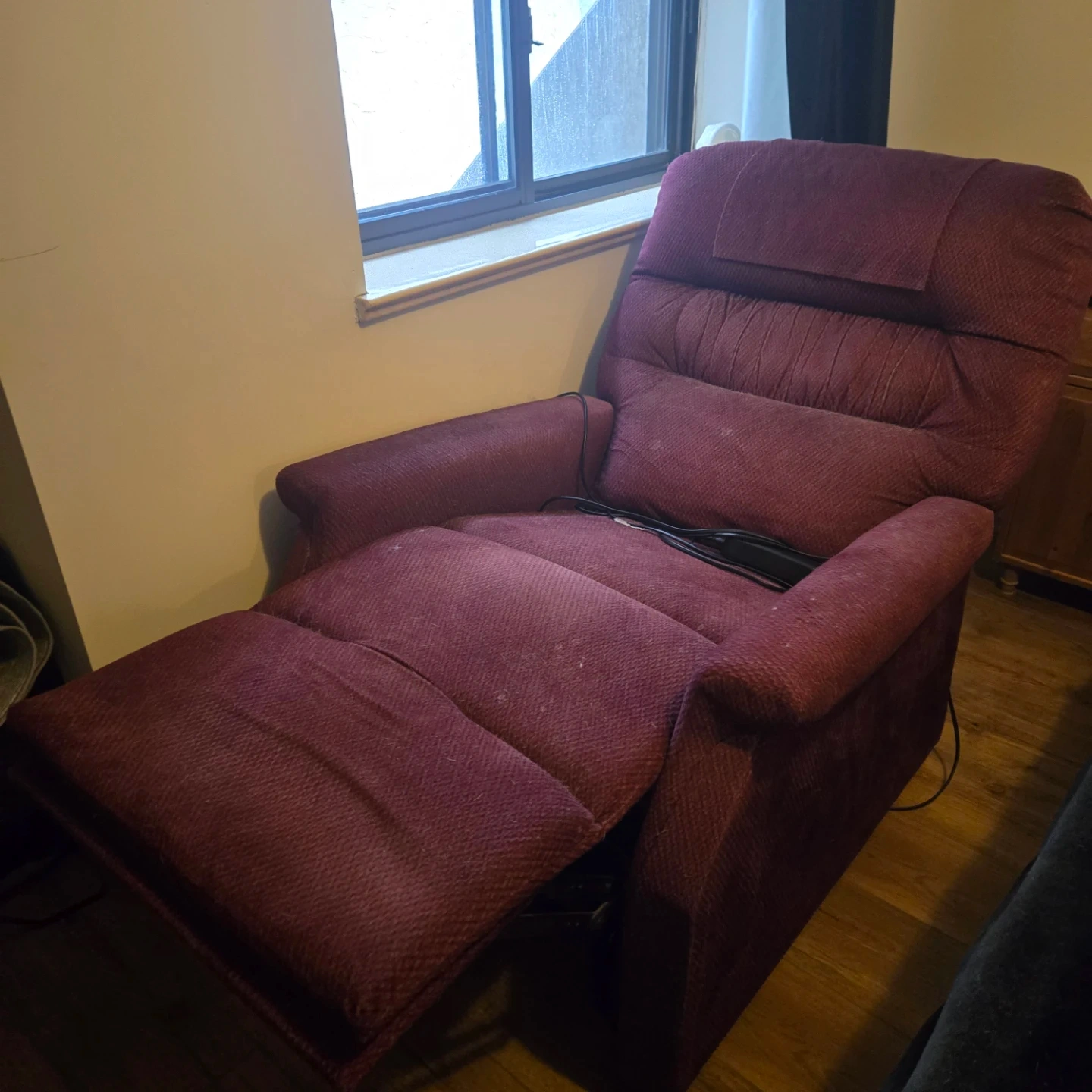 This burgundy recliner chair offers a lift function for easy standing. It's upholstered in a durable fabric. The chair includes a power cord and remote for operation