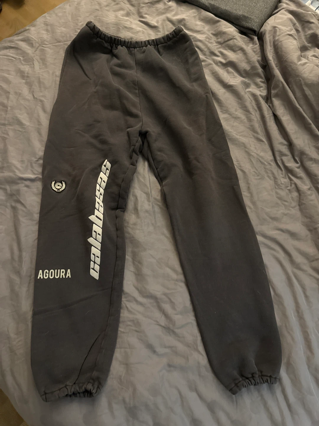 Grey sweatpants with 'Calabasas' and 'Agoura' print. Made in Greece. Cotton material.
