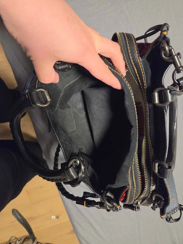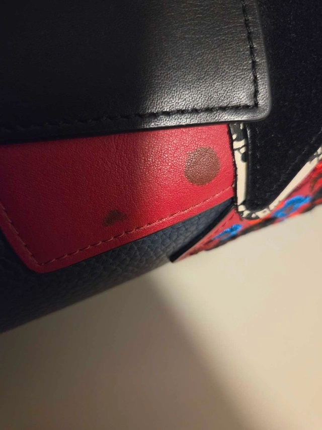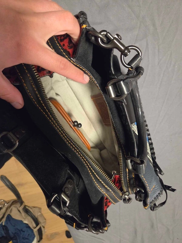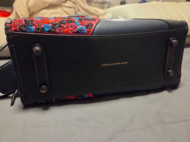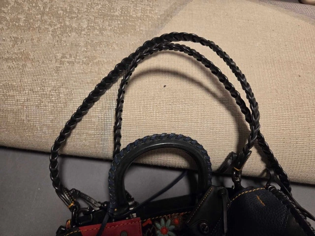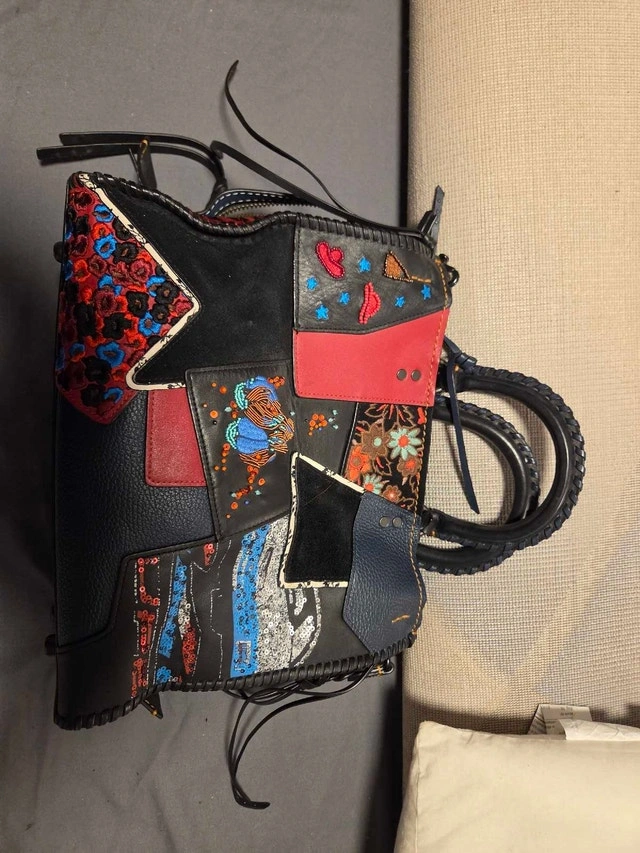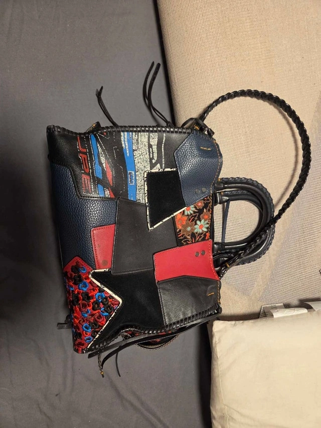Selling an authentic COACH EMBELLISHED PATCHWORK ROGUE Bag. It's got red, black, and blue smooth and pebble leathers and suede. It has a zip closure, a large compartment with beige fabric lining, a French kisslock coin purse, and one zip pocket. It has a COACH CREED PATCH 58159. There are two large open compartments with black suede fabric lining. It has black leather with blue leather whipstitch double handles with a 4 1/4" drop, and fringe. The sides of the bag are red suede animal print. The bag is outlined in black leather whipstitching with fringes (with mini studs on the ends of the fringe). It has gunmetal or black copper hardware. It comes with a COACH blue and black leather 1941 hangtag. It also has a COACH clochette. It has large gold top stitching. The bag is embellished with various designs, studs, sequins, embroidery, beads, printed leather designs, flowers, cars, and more! The details are fabulous. It's 12 1/4"W x 10 1/4"H x 5 3/4"D. Small strain pictured and light wear and tear, but otherwise excellent condition!