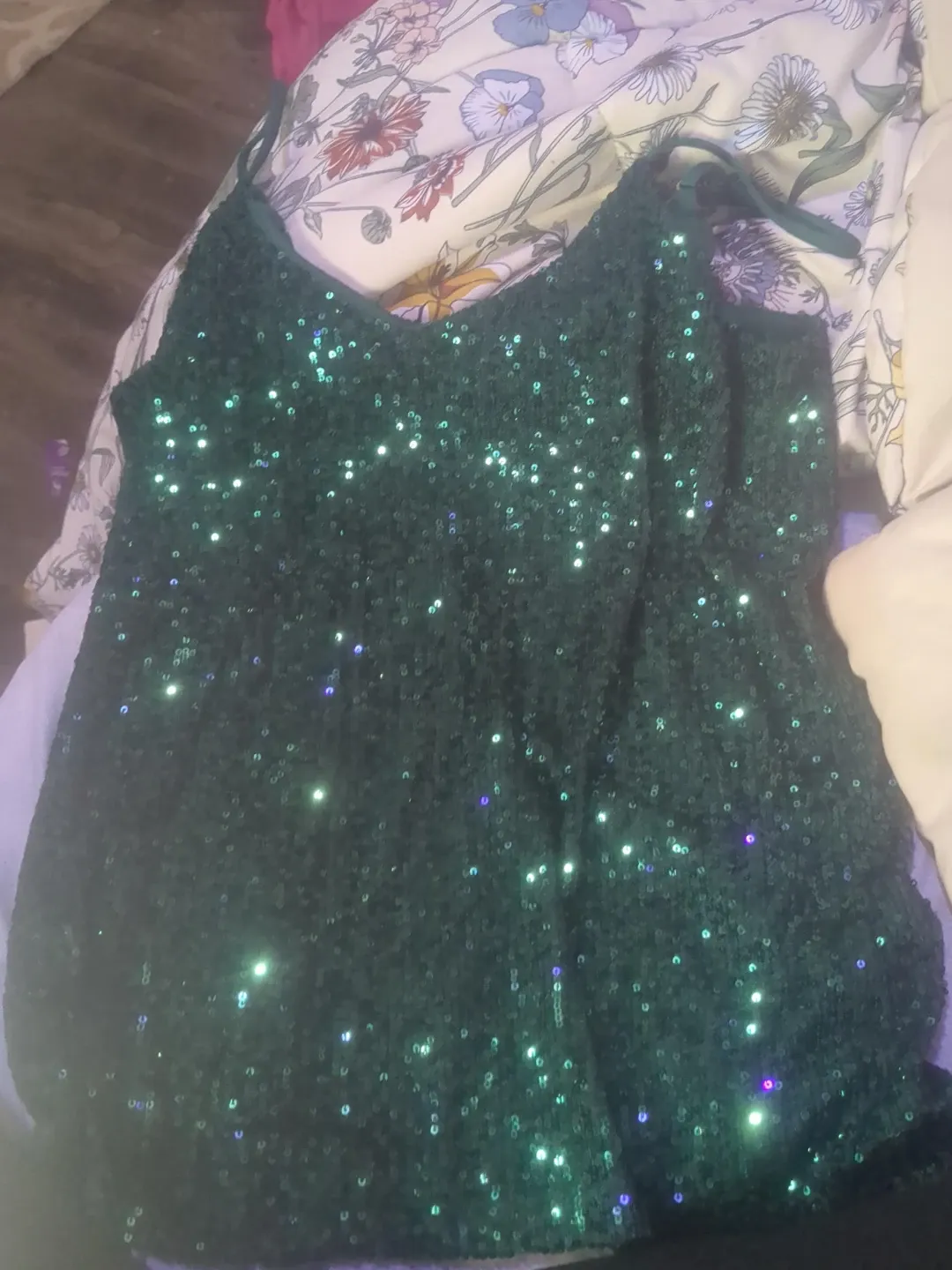 Shimmering emerald green camisole covered in all-over sequins. It's a limited edition piece from Ricki's. Size small. Perfect for adding some sparkle to your evening wear!