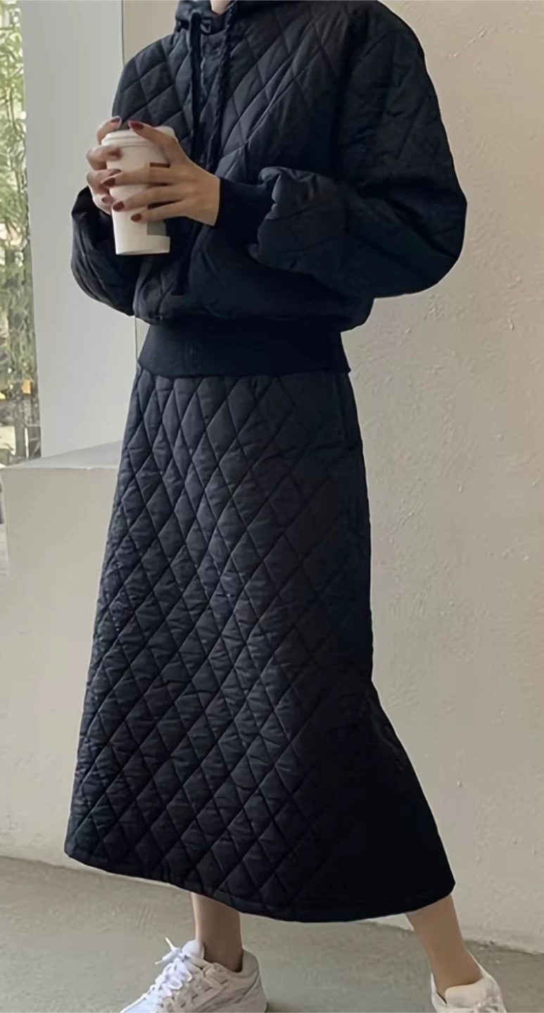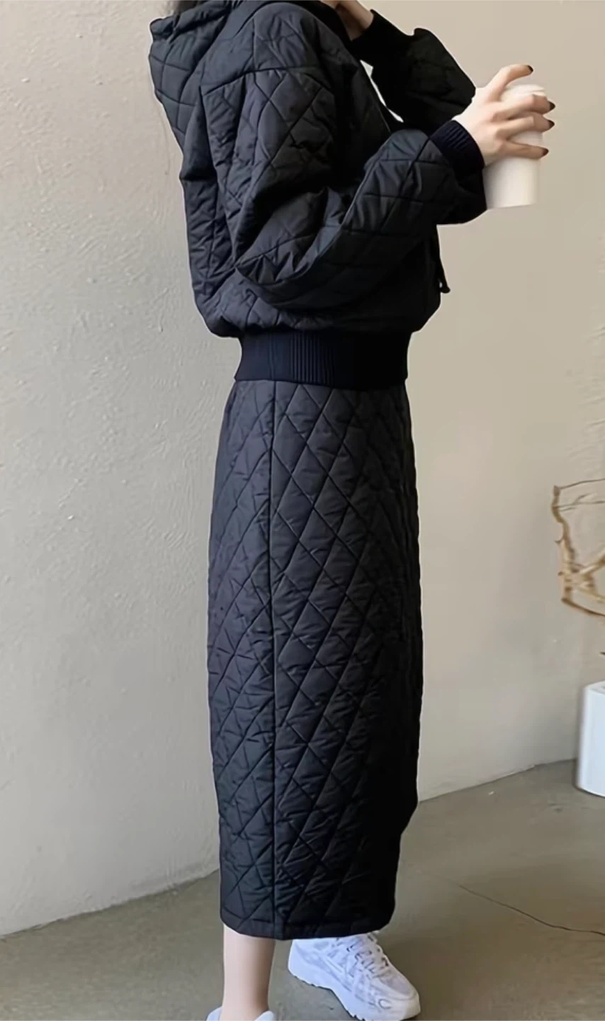 Black Quilted Padded Sweatshirt + High-Waisted A-Line Skirt Set