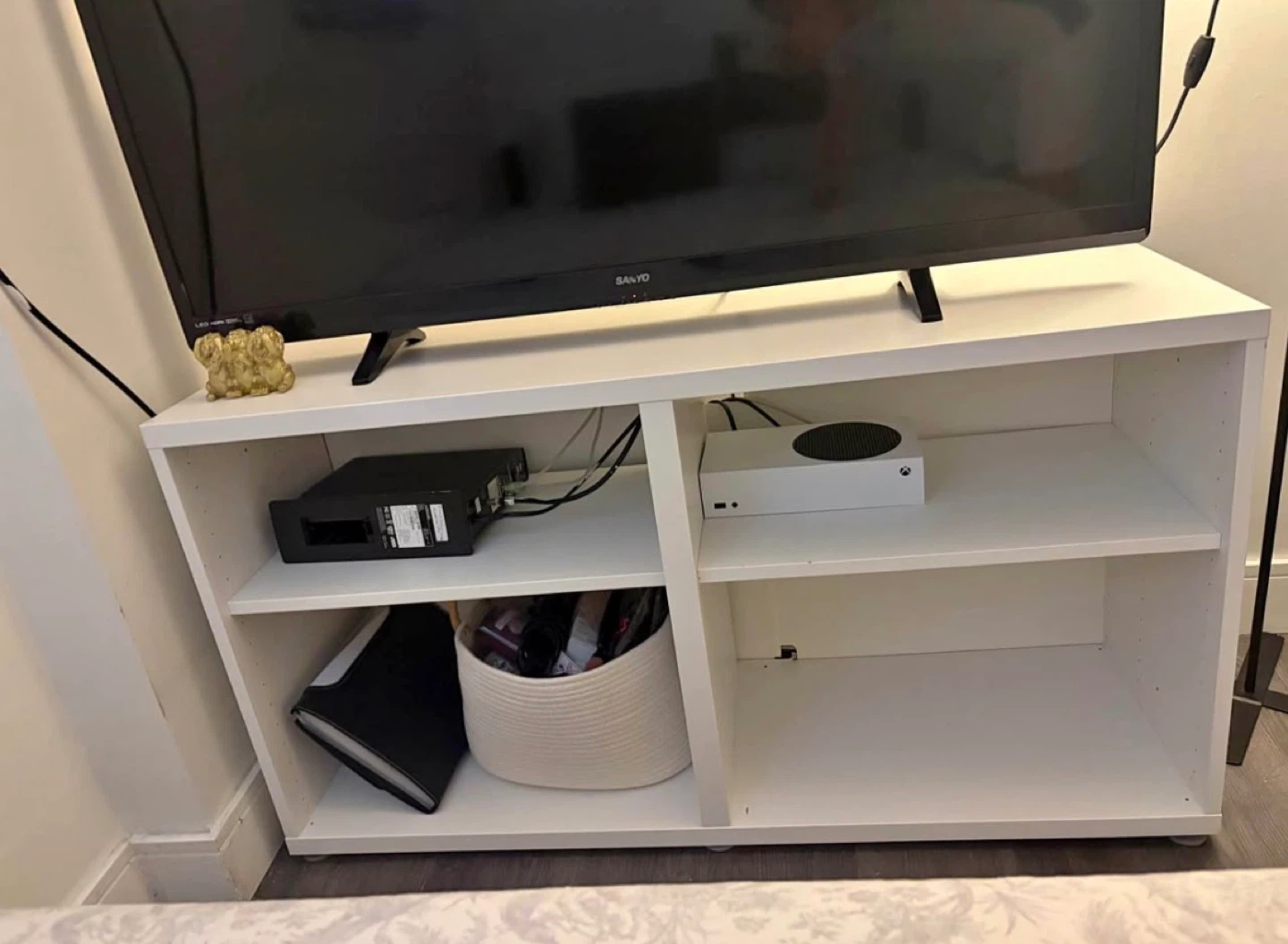 White two-shelf media console with open compartments. Perfect for organizing your entertainment setup.