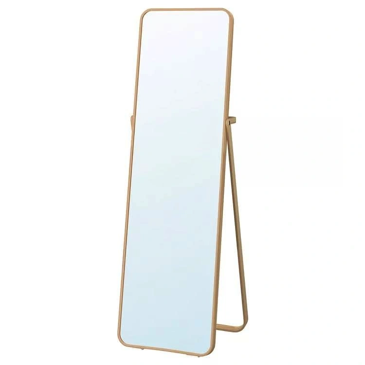 IKEA IKORNNES standing mirror in ash wood. Full-length design with a built-in hanger behind, perfect for organizing outfits and adding a warm Scandinavian touch to your space.