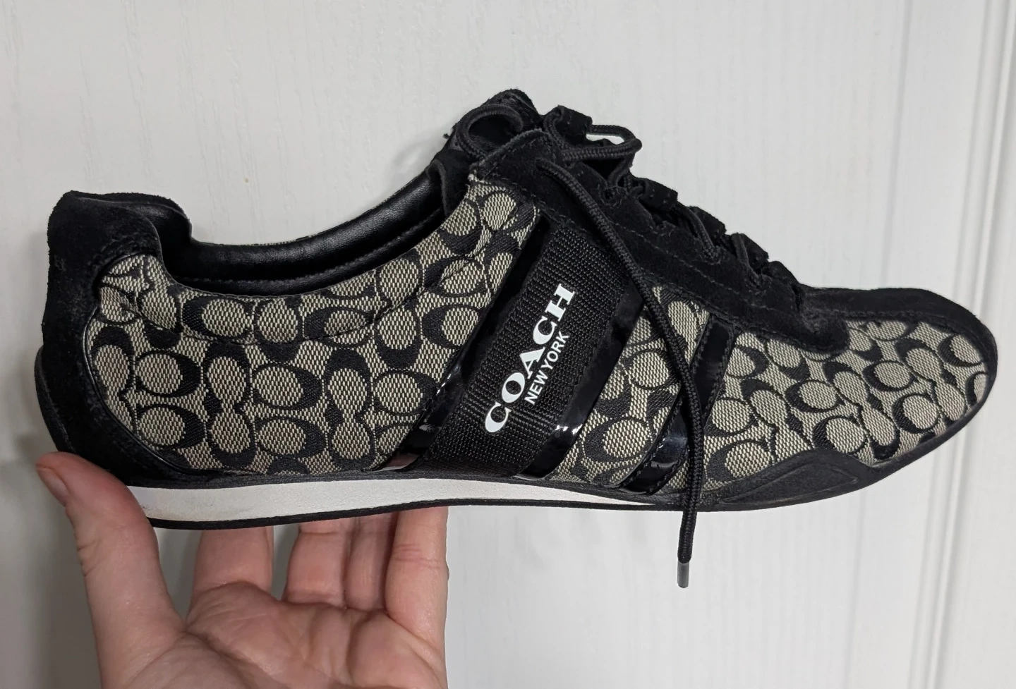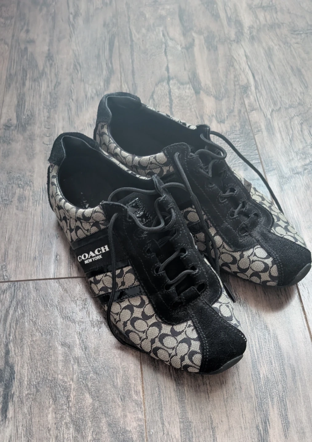 Coach New York sneakers with signature print. Lace-up closure and features the classic signature 'C' pattern with black suede accents