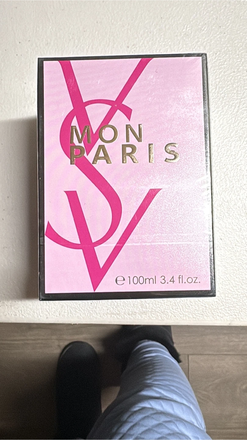 This is the Yves Saint Laurent Mon Paris Eau de Parfum. It's a 100ml bottle, which is 3.4 fl. oz. The packaging is pink with bold lettering.