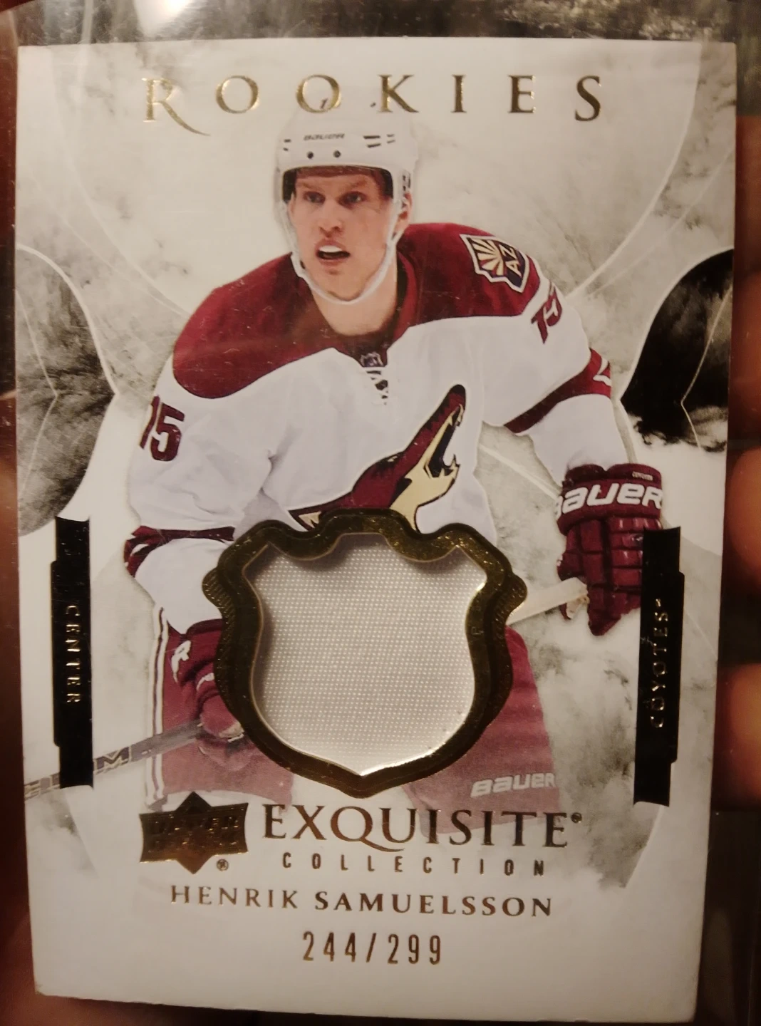 Selling a Henrik Samuelsson rookie hockey card from the Exquisite Collection. It features a piece of game-used memorabilia. A great collectible for any hockey fan!