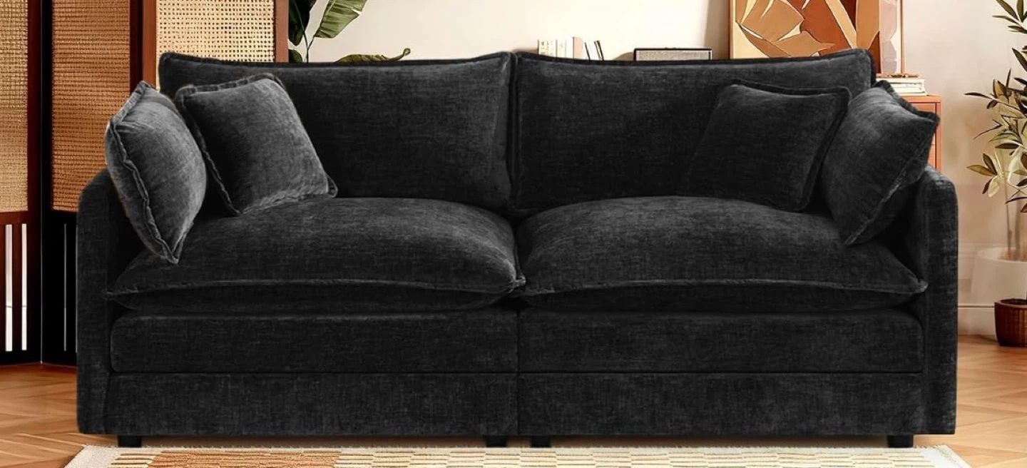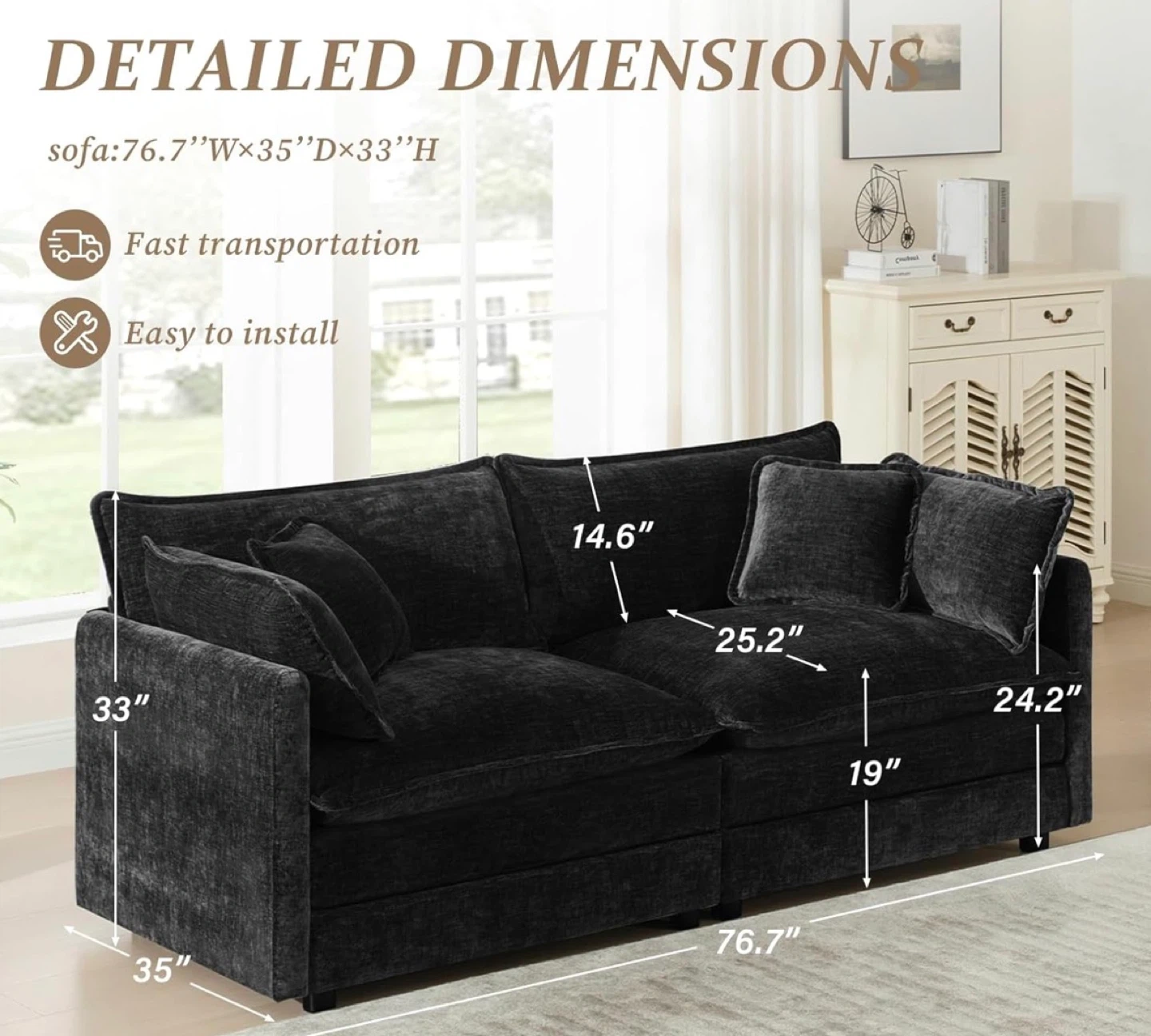 This black upholstered sofa offers plush seating with two included accent pillows. It's a comfortable addition to any living space. Sofa dimensions: 76.7" W x 35" D x 33" H. Seat depth is 25.2" and seat height is 19".