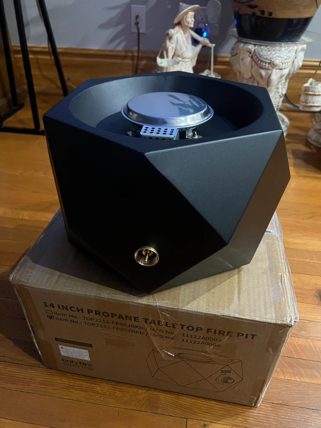 This is a 14-inch propane tabletop fire pit from Onlyfire. It's designed for outdoor living and includes a regulator. The item comes in its original box.