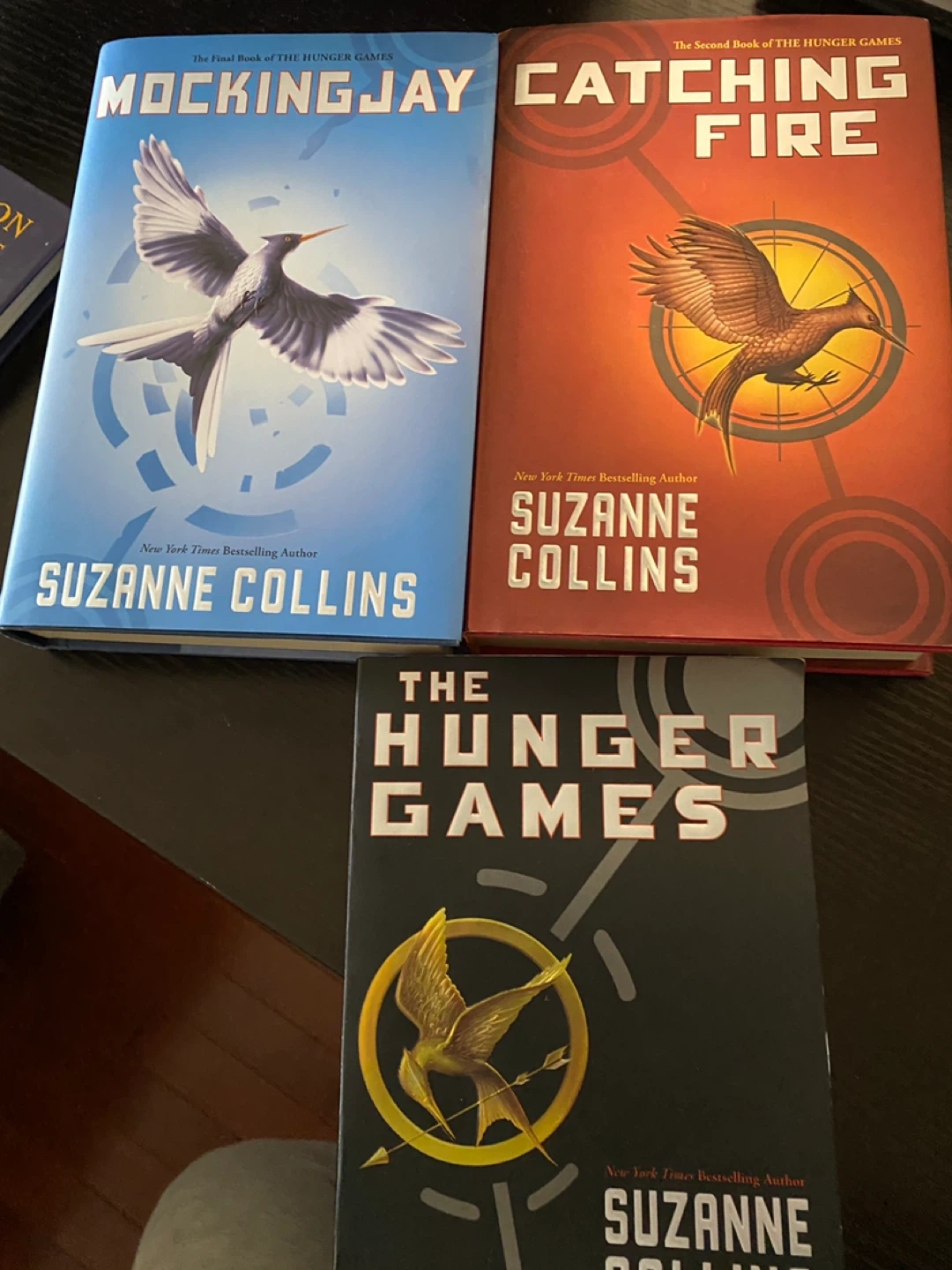 This is a set of three books from The Hunger Games series by Suzanne Collins. It includes "The Hunger Games", "Catching Fire", and "Mockingjay". These are hard cover editions.