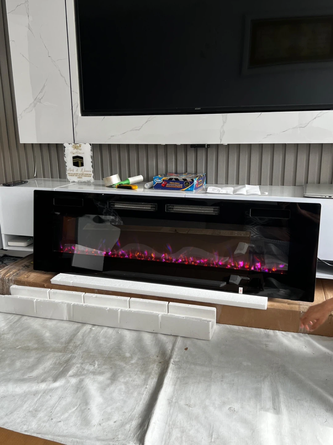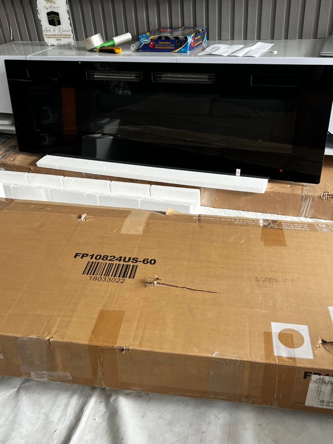 Black electric fireplace with customizable heating options. Features overheat protection and ETL certification. Includes timer settings and low-noise operation. Remote is missing.