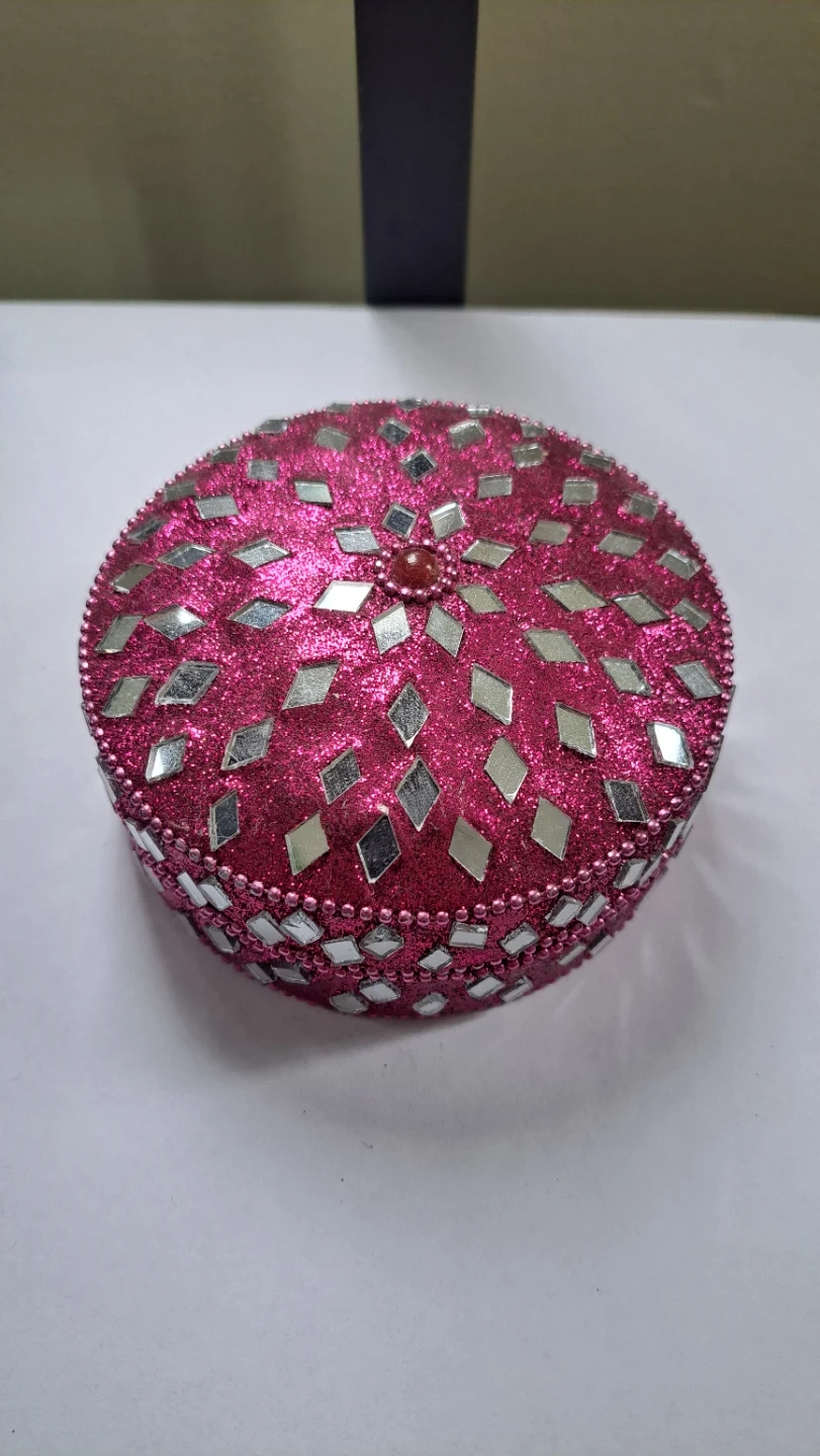 This decorative tin box is covered in pink glitter and features a mirror mosaic design with beaded trim. It's perfect for storing small trinkets or as a unique decorative piece. The tin is made of metal.