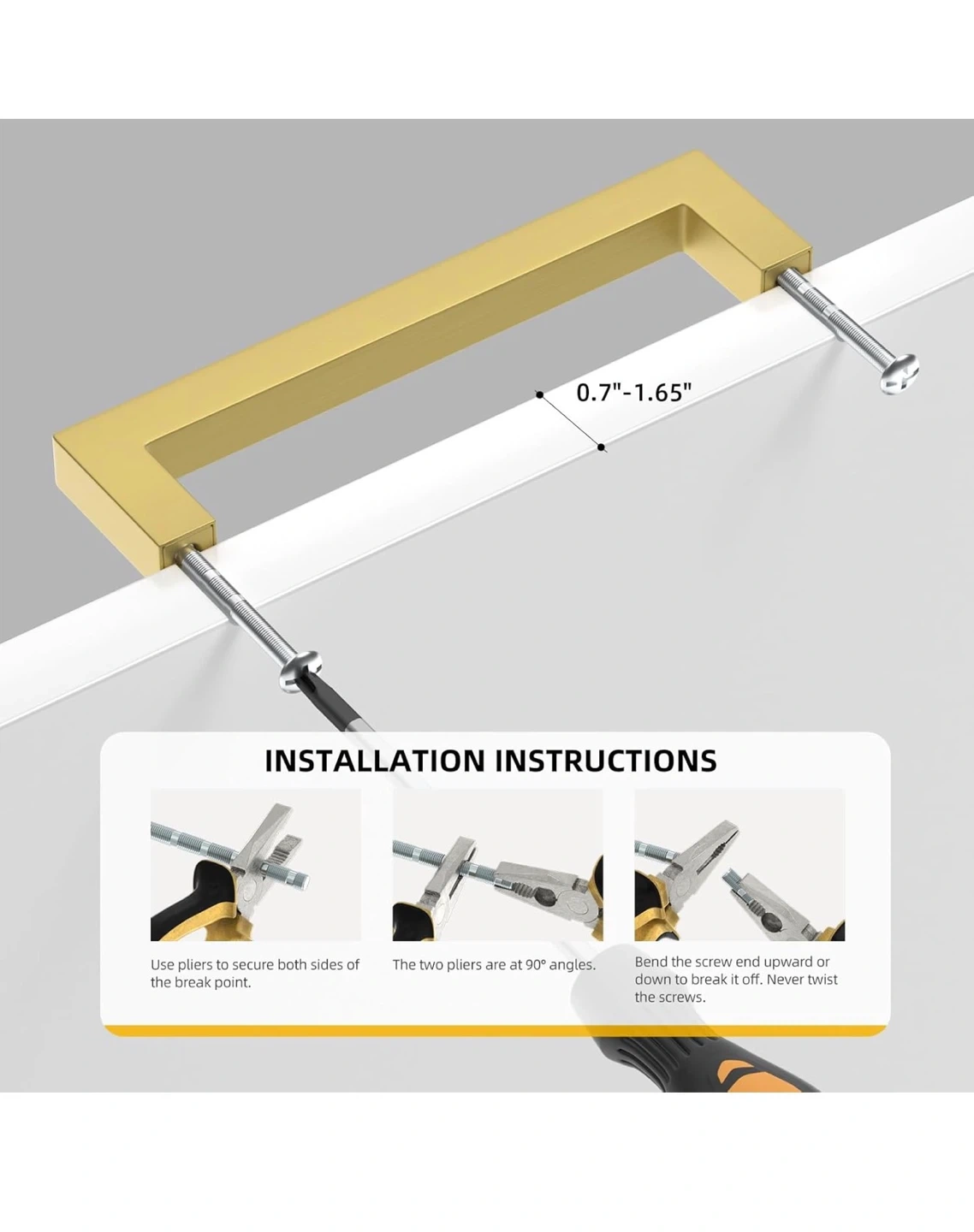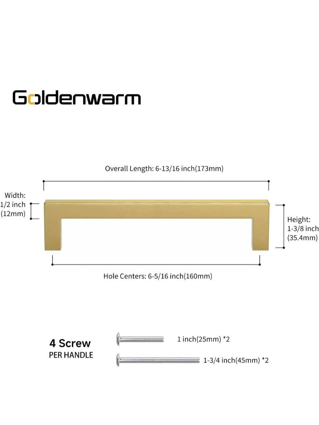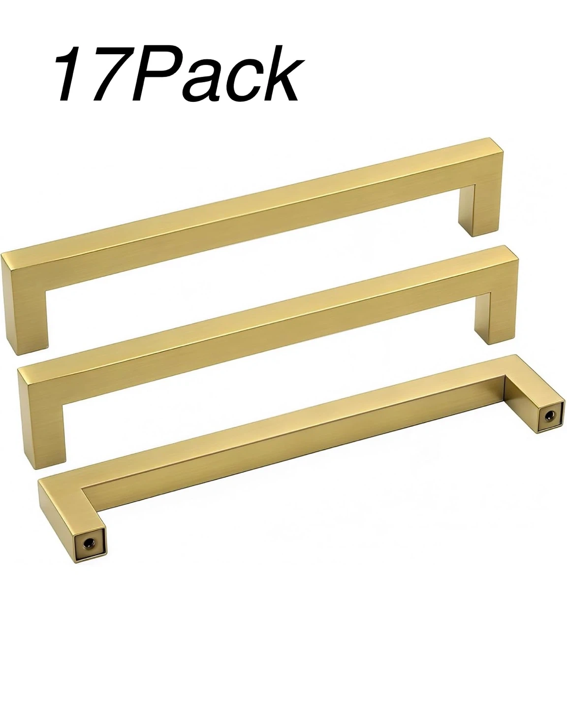 Set of 17 brass cabinet and drawer pulls. Each pull has a 6-13/16 inch (173mm) overall length. Hole centers measure 6-5/16 inch (160mm). Includes 4 screws per handle, with 1 inch (25mm) and 1-3/4 inch (45mm) lengths provided. Width is 1/2 inch (12mm) and height is 1-3/8 inch (35.4mm).