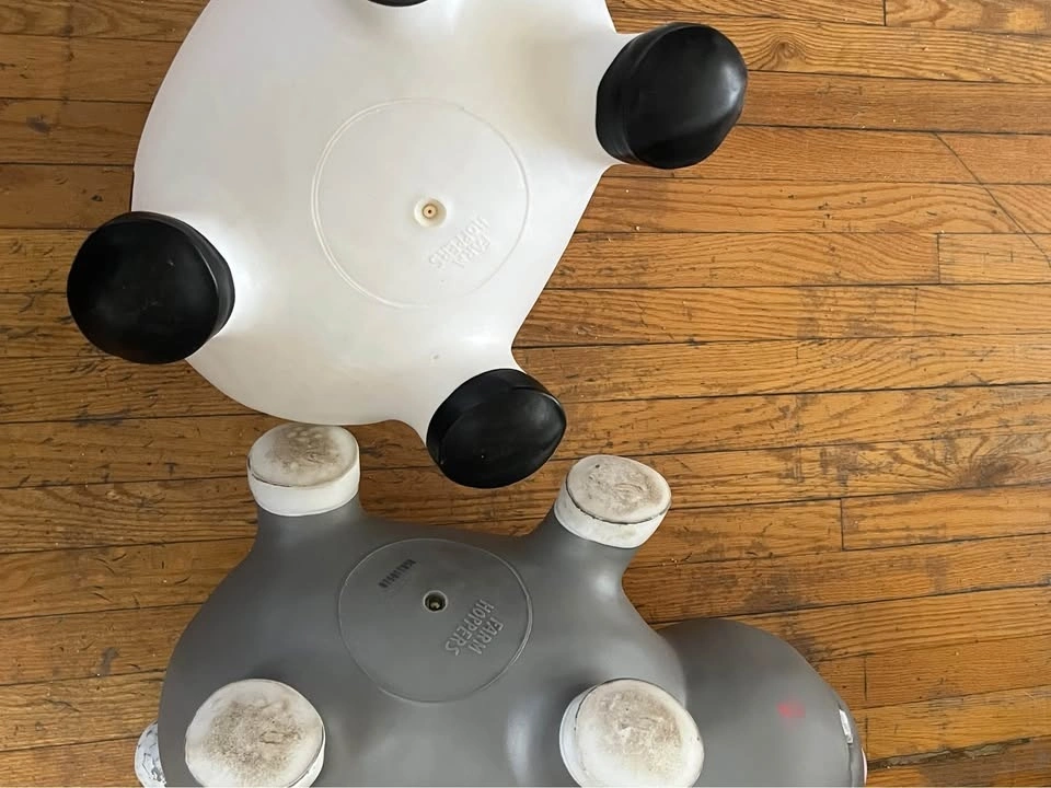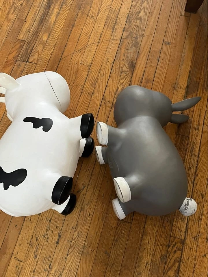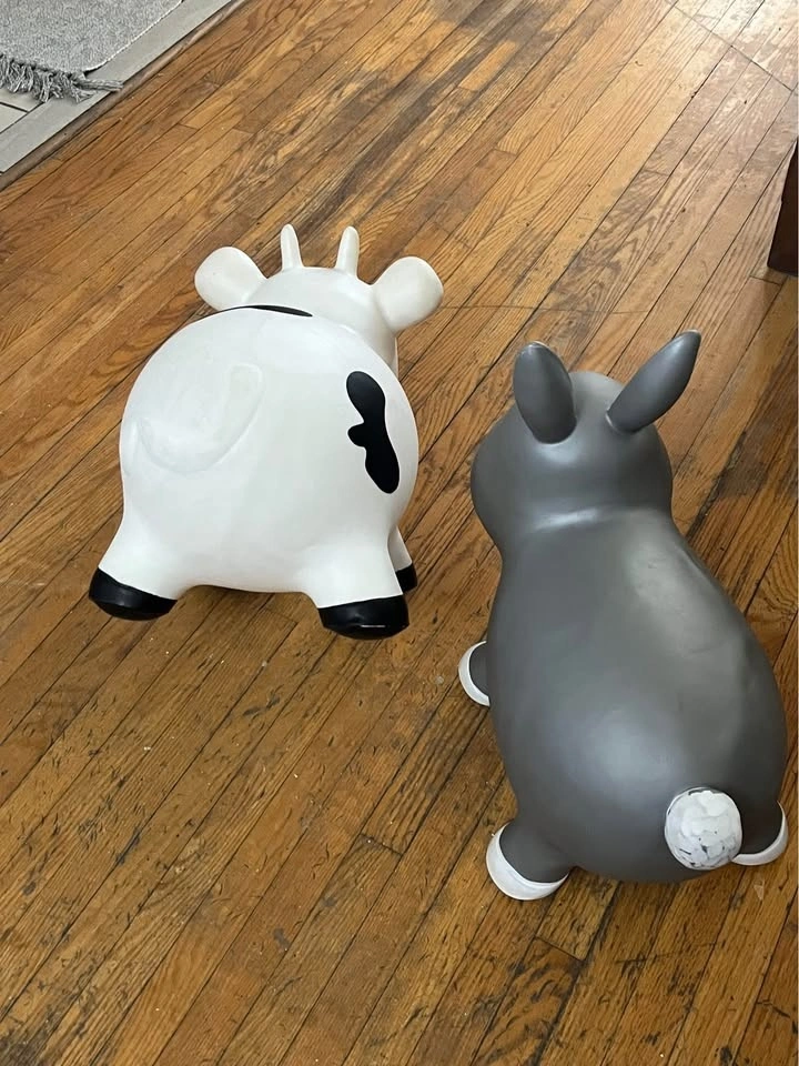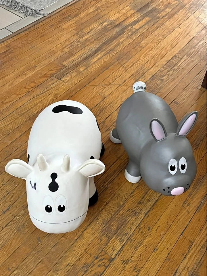 Cute Farm Hoppers set of two. Includes a white cow and a grey bunny. These are inflatable ride-on toys for kids. Both are inflated and ready for bouncing fun. They just need a little bit of cleaning.