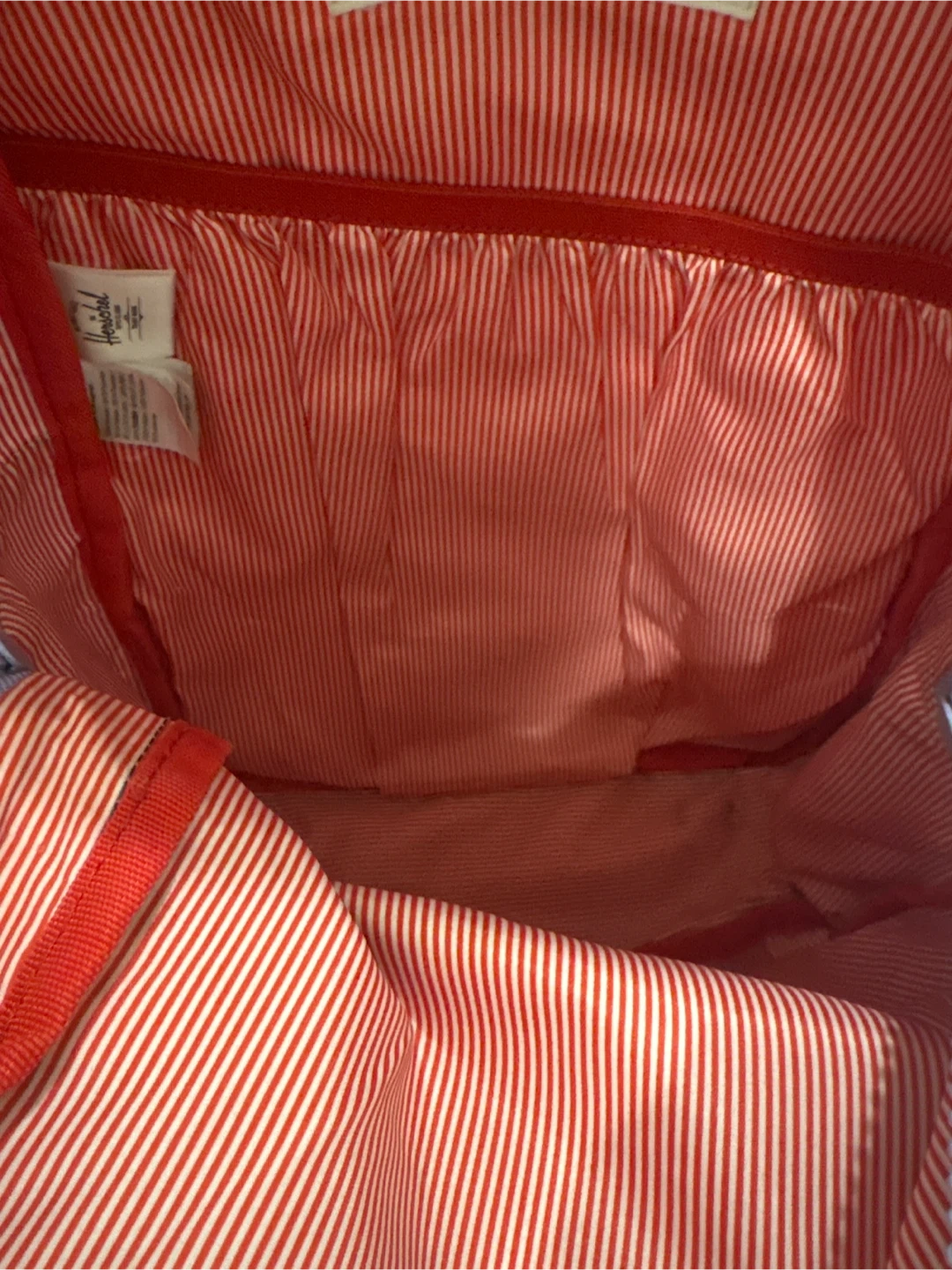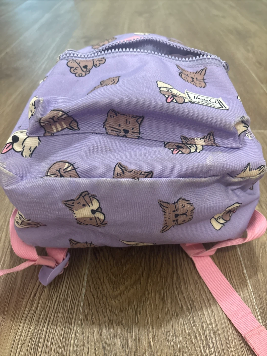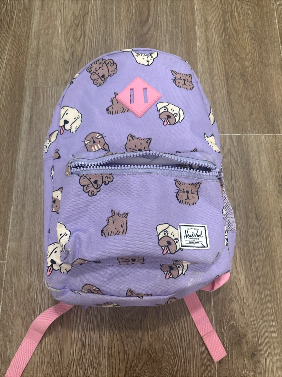 Herschel Little America backpack with a fun purple print featuring dogs and cats. It has a main compartment and a front pocket. The interior lining is red and white striped.