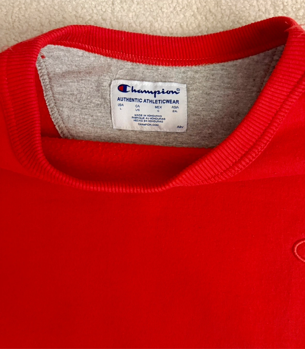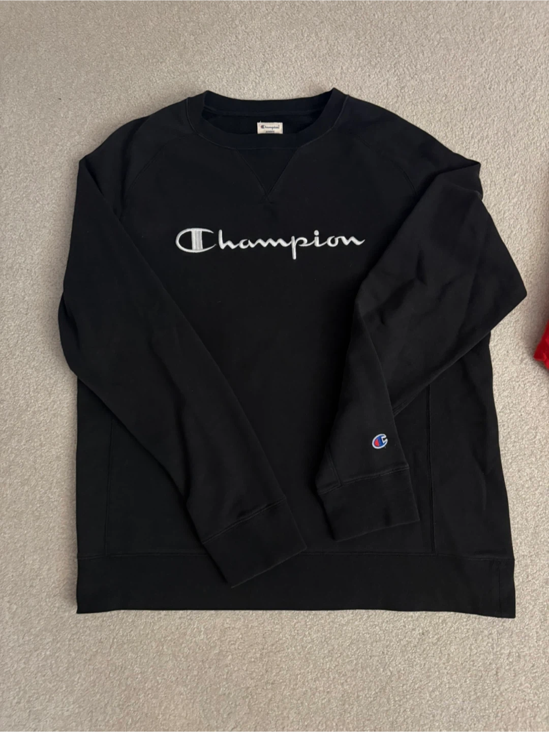 2 Champion Crewnecks - Red and Black, Size Large