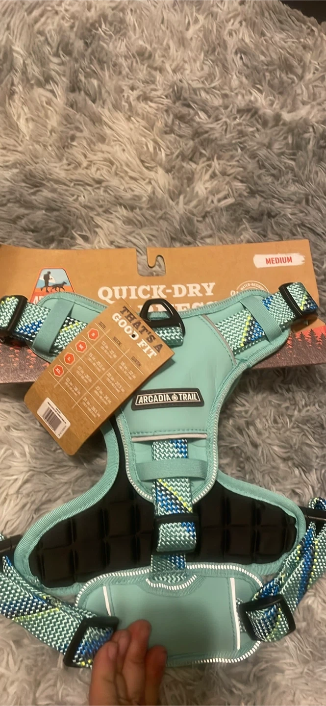 Arcadia Trail quick-dry dog harness. Features reflective trim and adjustable straps for a good fit. Medium size.