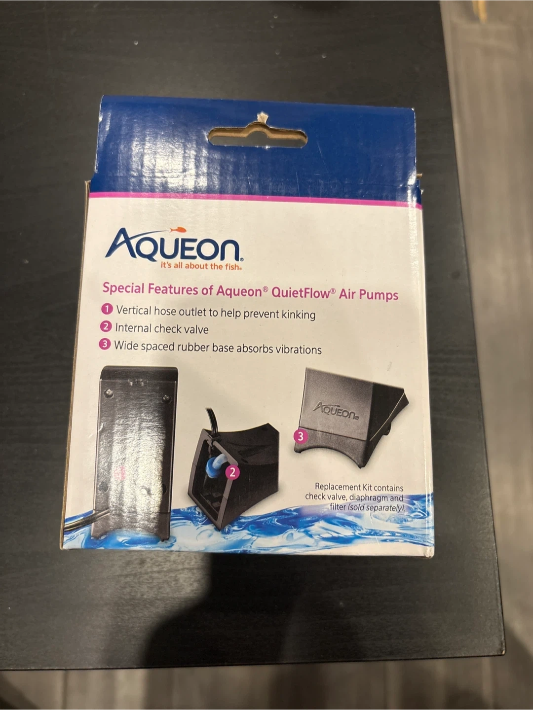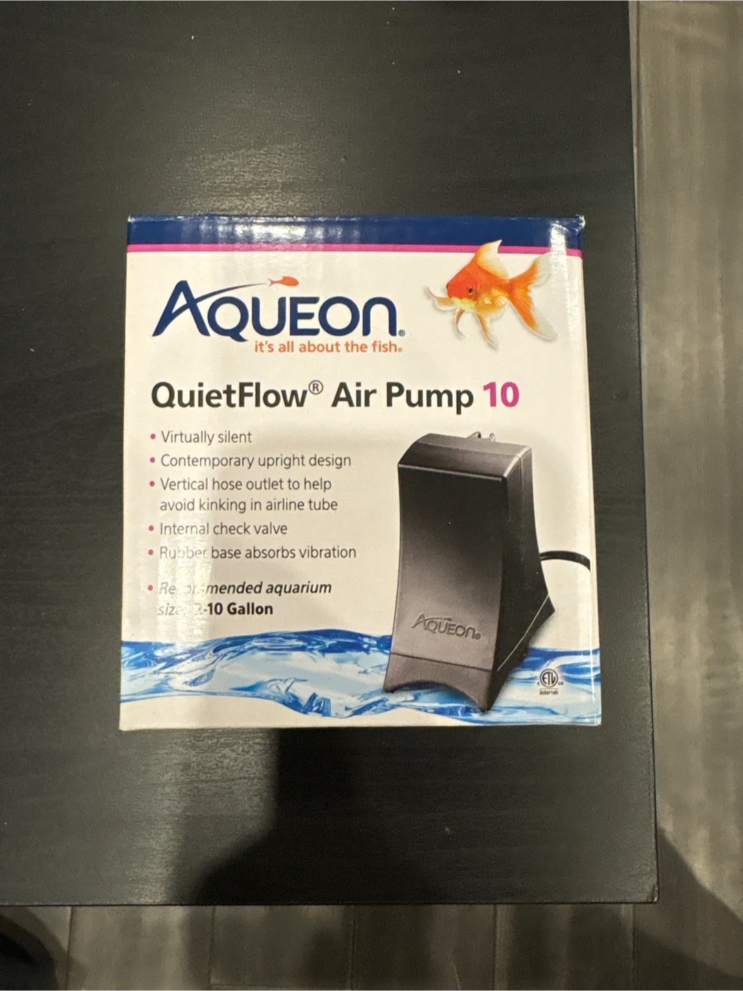 Selling a brand new Aqueon QuietFlow Air Pump 10, still in its original packaging! This pump is virtually silent and features a contemporary upright design. It also has a vertical hose outlet to help avoid kinking in the airline tube, plus an internal check valve and a rubber base that absorbs vibrations. Recommended for aquariums up to 10 gallons!