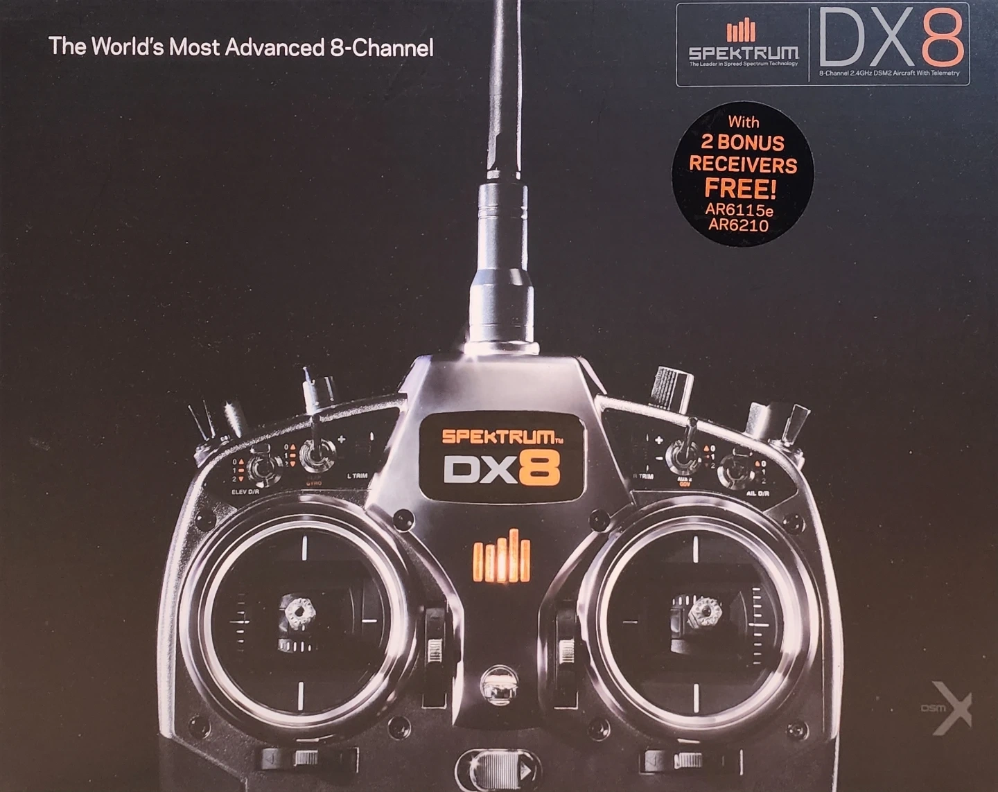 This Spektrum DX8 is an 8-channel 2.4GHz DSM2 aircraft transmitter with telemetry. It comes with 2 bonus receivers: AR6115e and AR6210. This transmitter is great for advanced RC aircraft control.