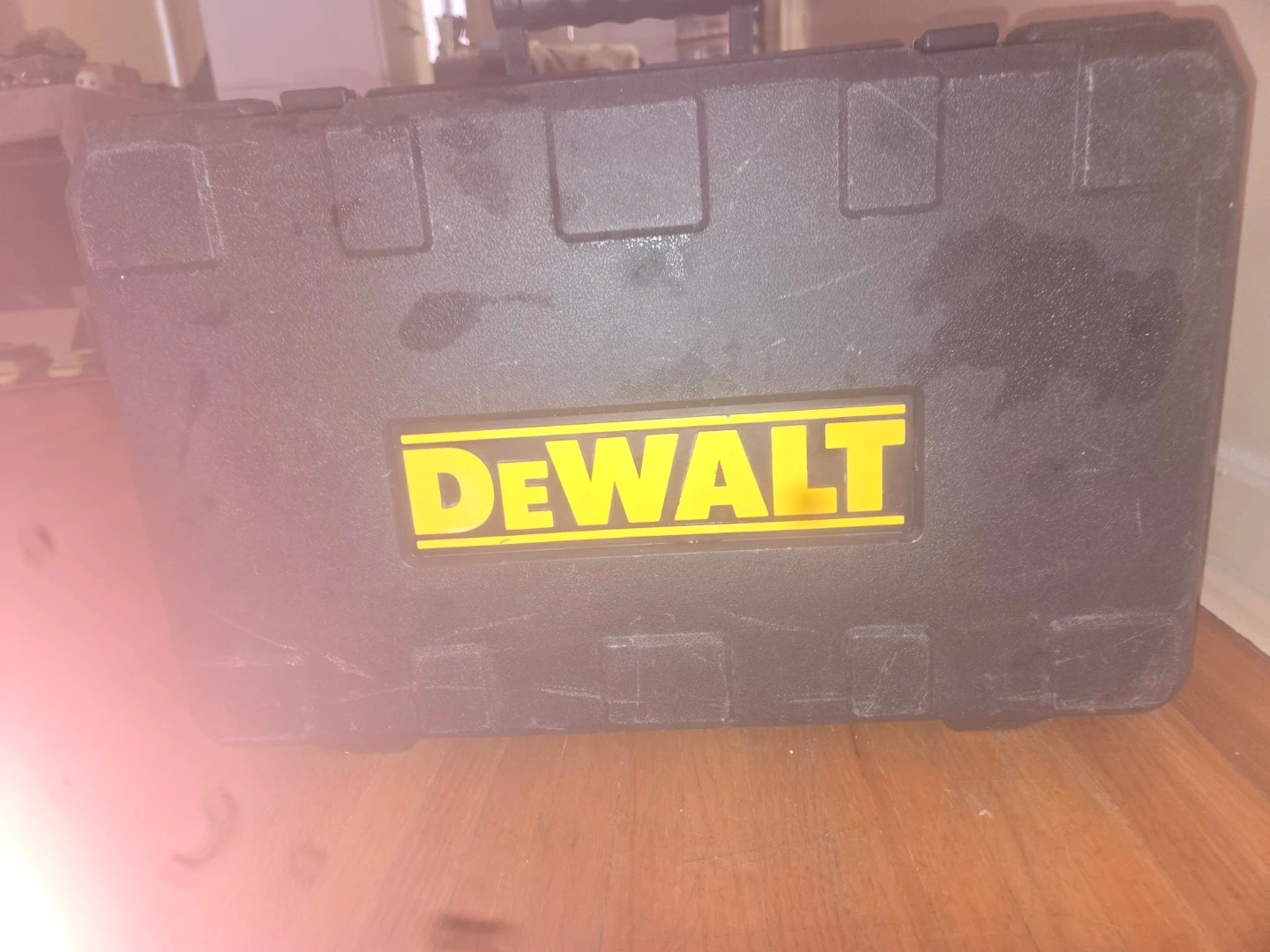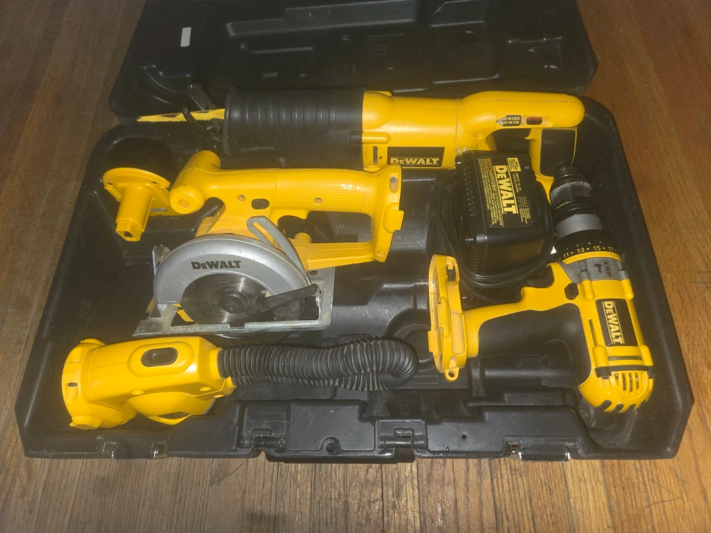 This DEWALT cordless tool set includes a reciprocating saw, circular saw, drill, and flashlight. All tools are yellow and black and come in a black carrying case. It's powered by DEWALT batteries. NEEDS NEW BATTERY