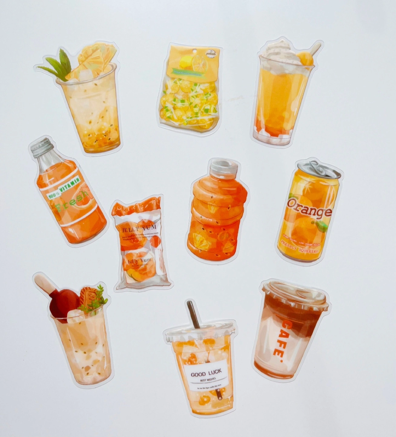 Ten aesthetically pleasing stickers. Features various orange-themed drinks and snacks. Perfect for journals, planners, or laptops. Brand new.