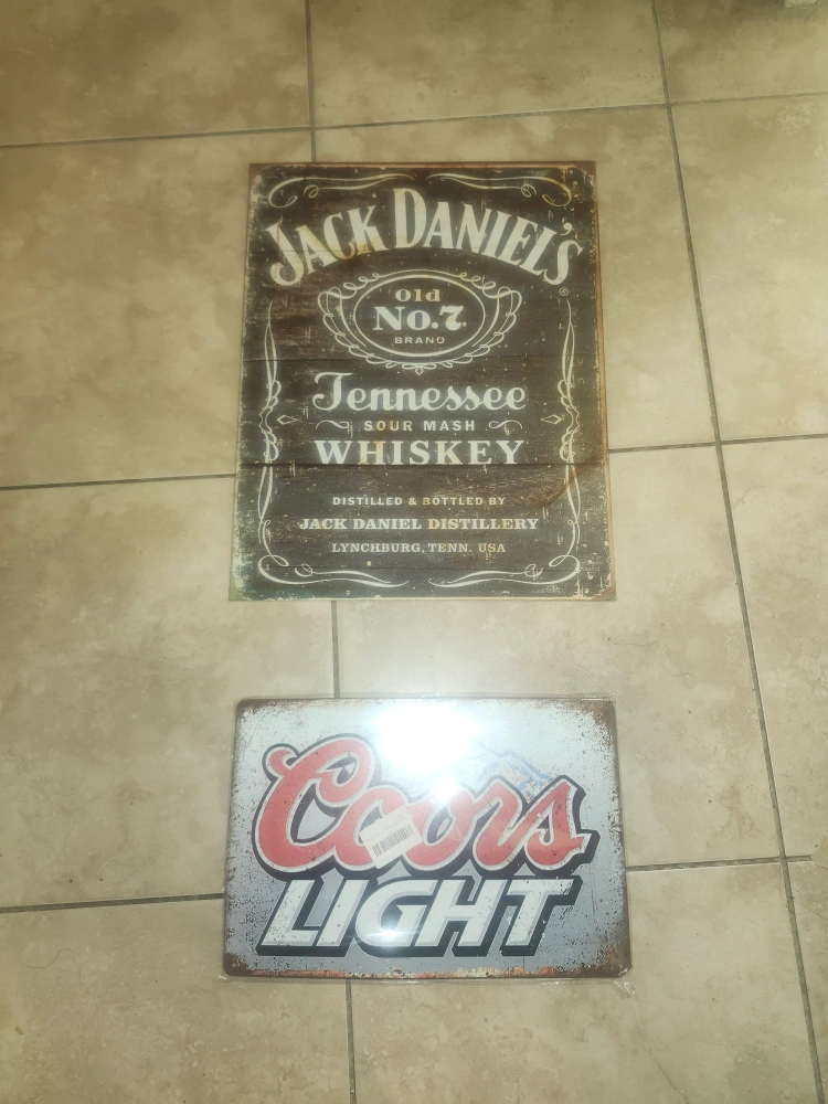Selling two metal signs: one Jack Daniel's Tennessee Whiskey sign and one Coors Light sign! They'd look great in a bar or rec room