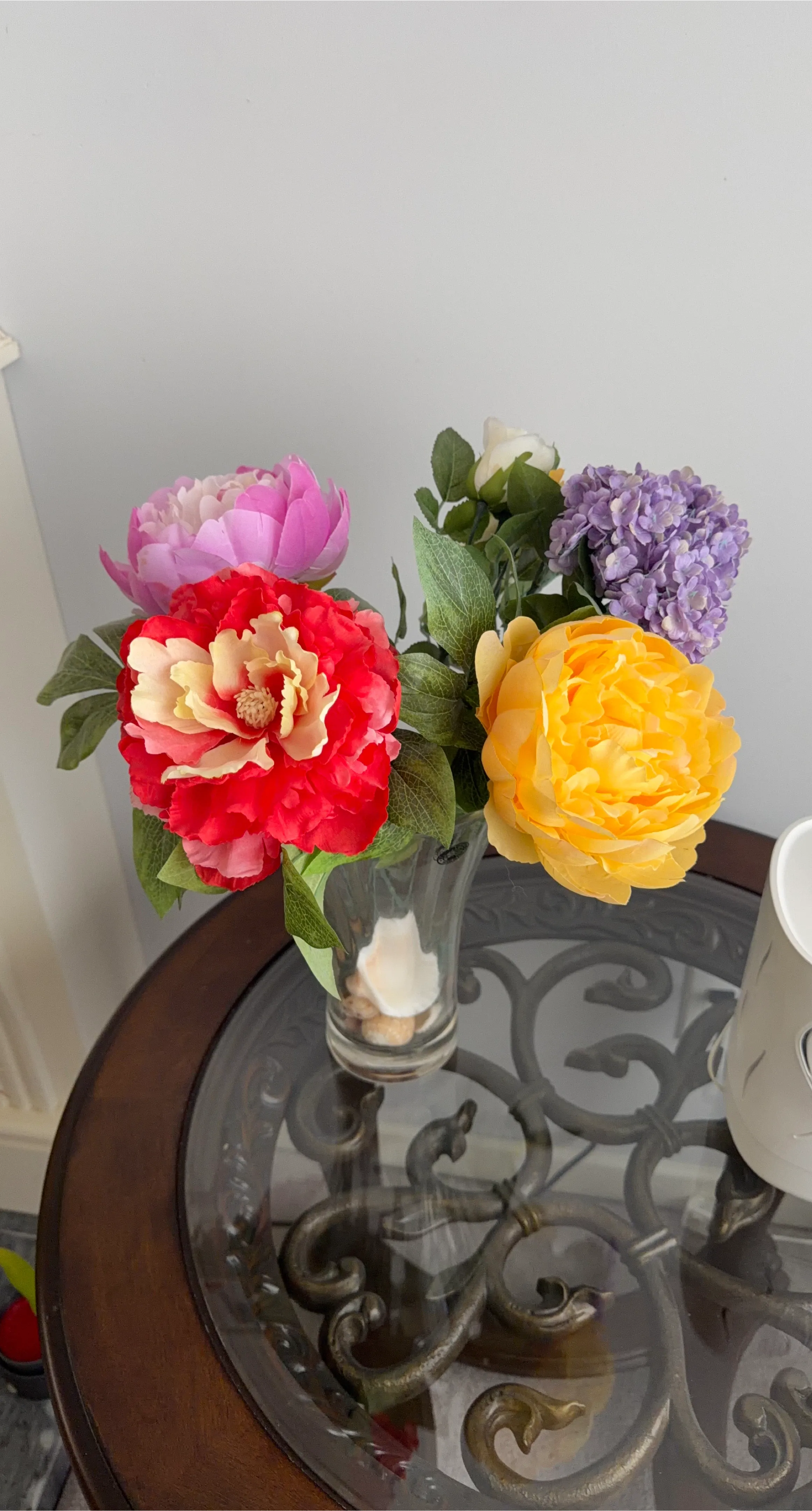 This is an artificial flower arrangement featuring peonies and hydrangeas in a clear glass vase. The bouquet includes a large red and yellow peony, a pink peony, a yellow peony, and purple hydrangeas. The vase contains decorative shells and stones at the bottom.