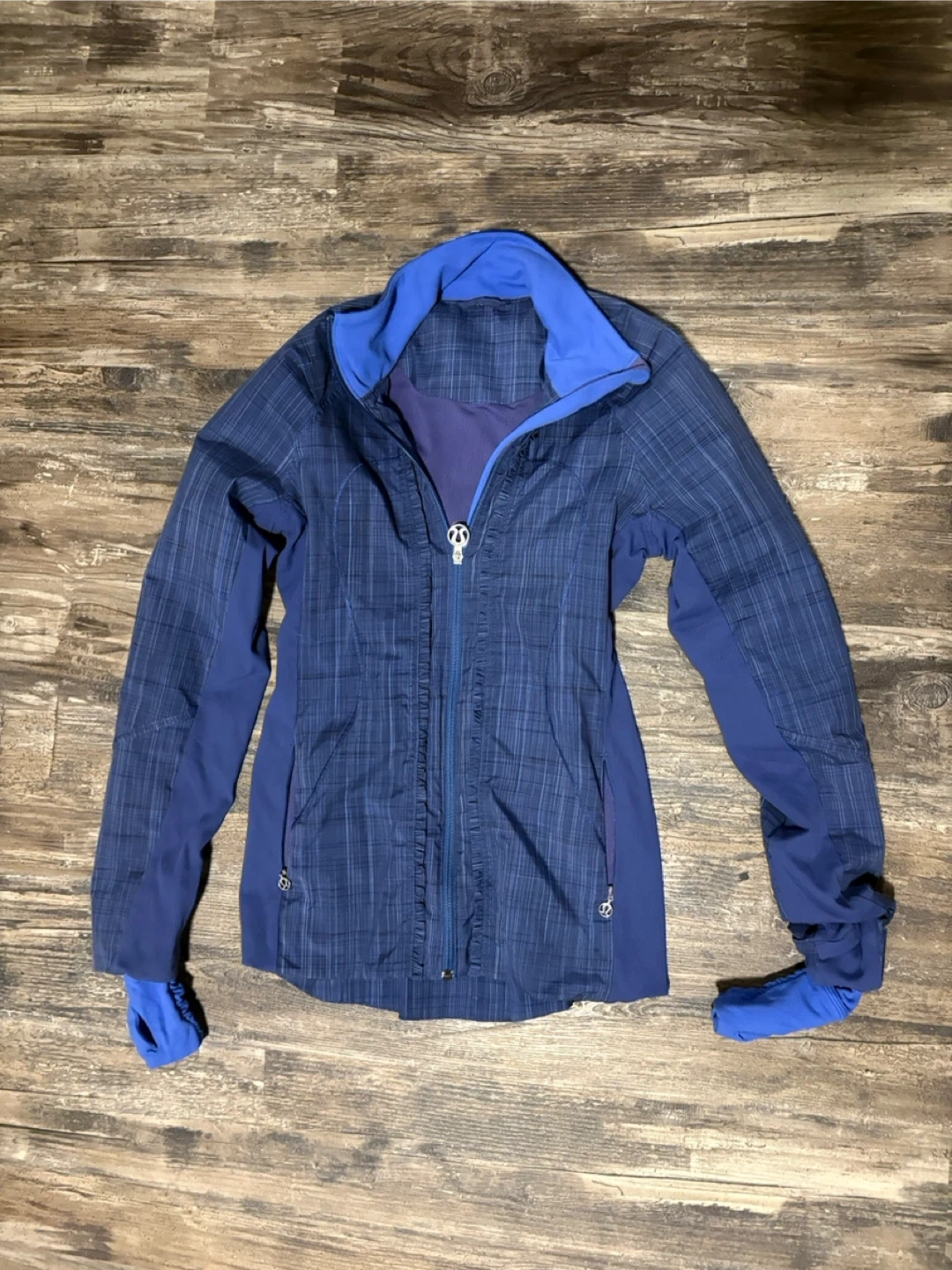 Lululemon blue jacket features a subtle plaid pattern and contrasting solid blue sleeves and collar. It includes zippered pockets for secure storage and thumbholes on the cuffs. Lightweight and practical for outdoor activities. Tag fell off so unsure of exact size but pretty sure it’s a small.