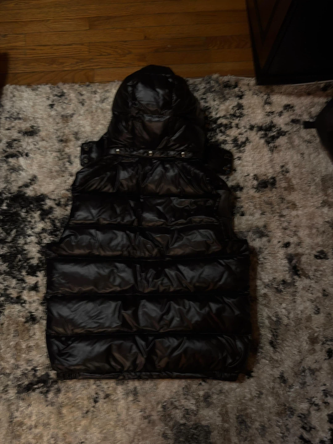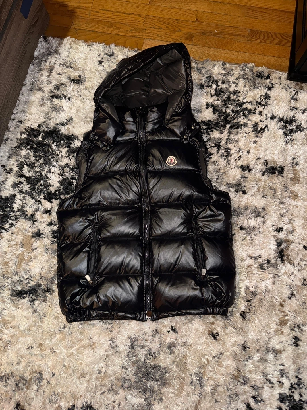 This is a Moncler black down puffer vest with a hood. It's a shiny, quilted vest. Made with high-quality materials for warmth and style!