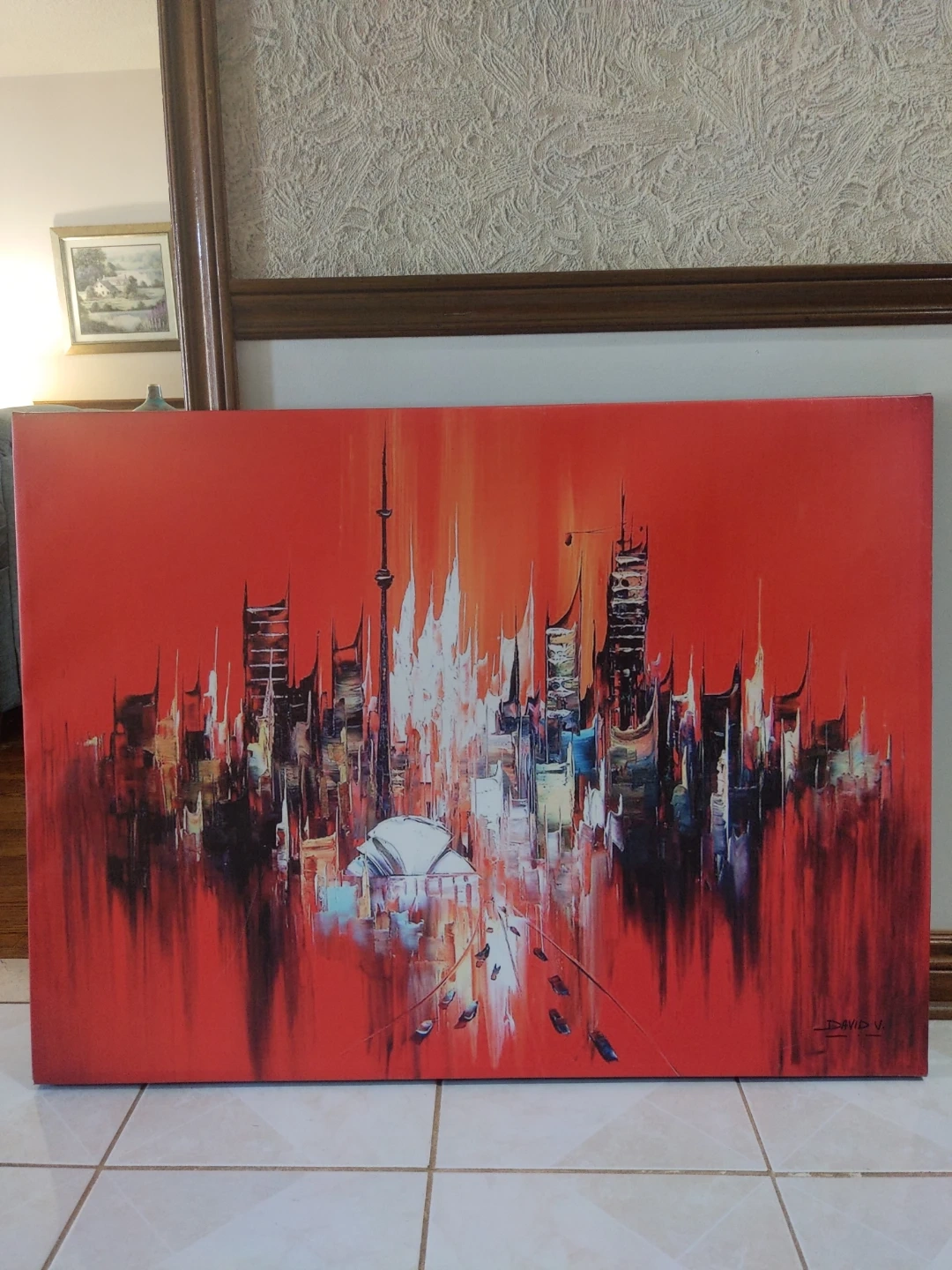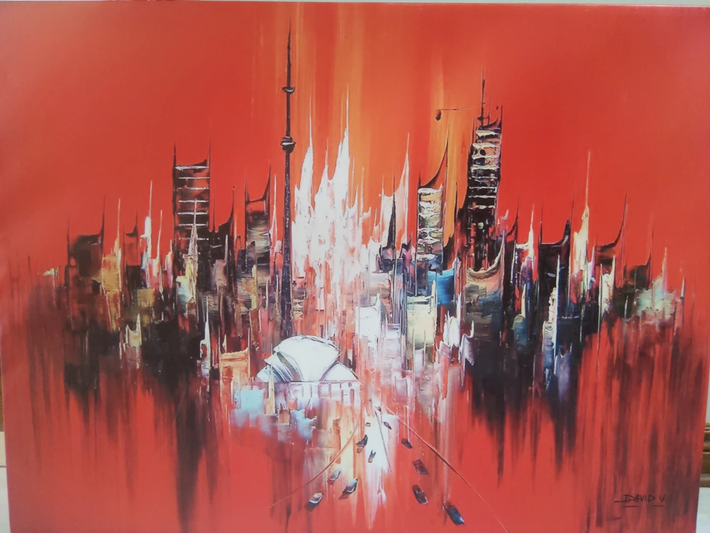 Bold abstract painting depicting a vibrant cityscape with iconic structures like the CN Tower.