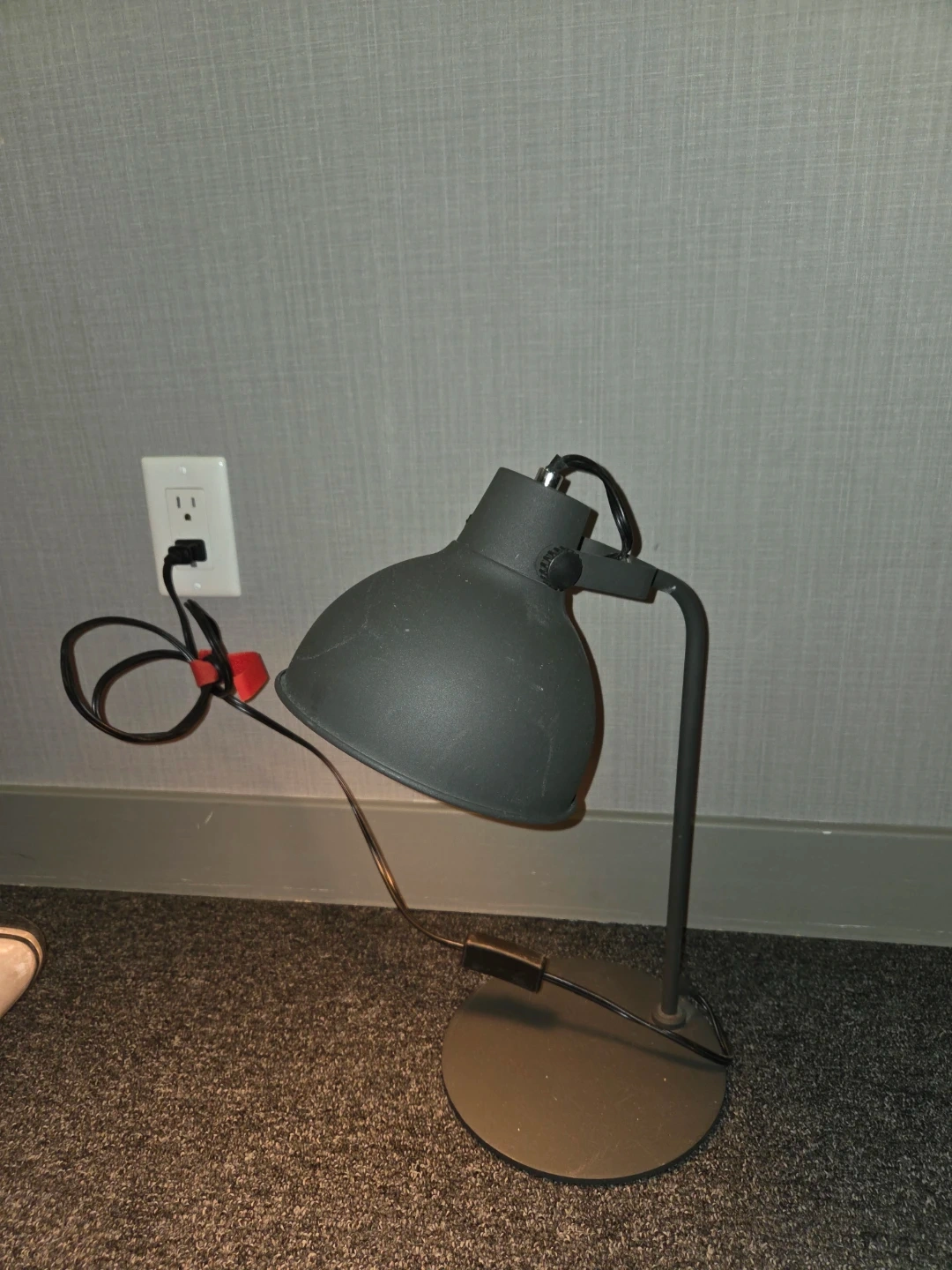 This is a Structube grey desk lamp with an adjustable arm and head. It has a sturdy base and a black cord with an inline on/off switch. The lamp is made of metal. In great working condition.